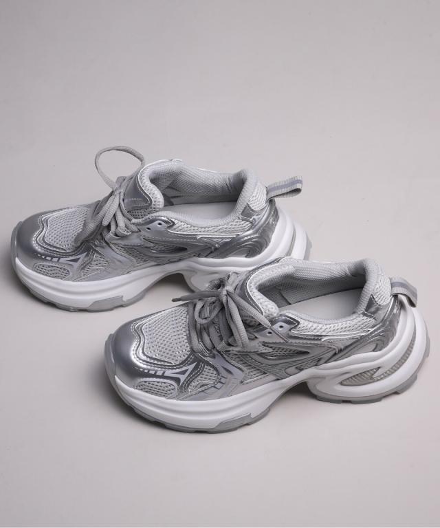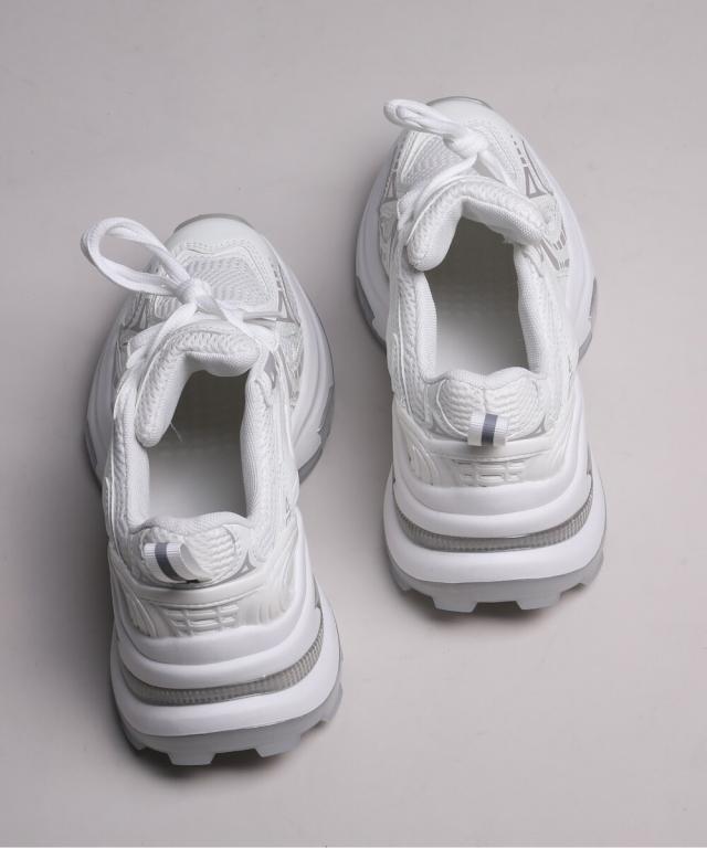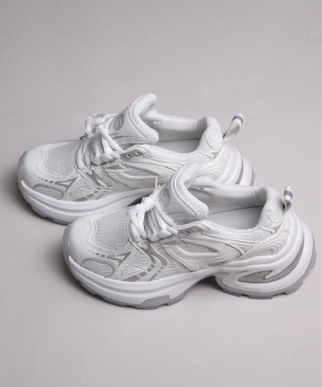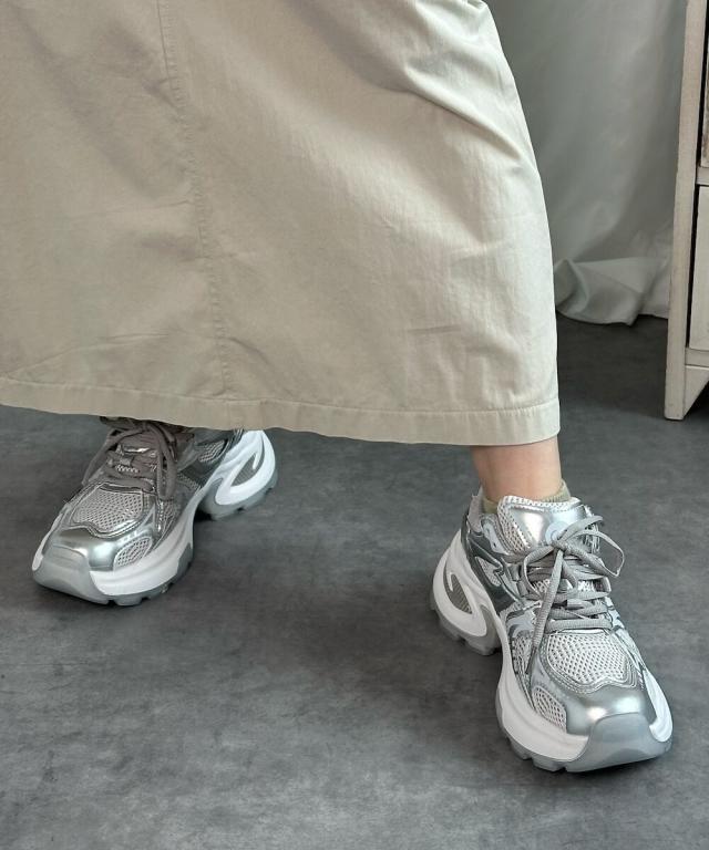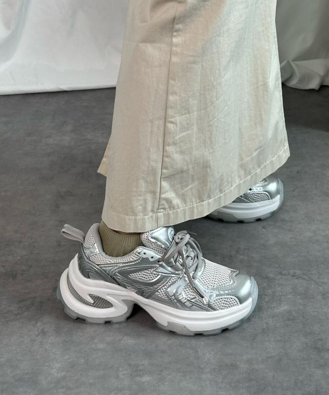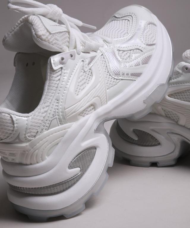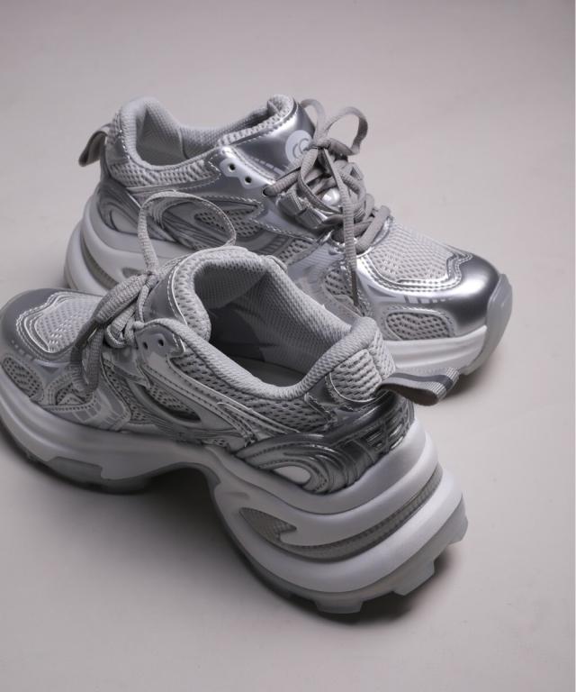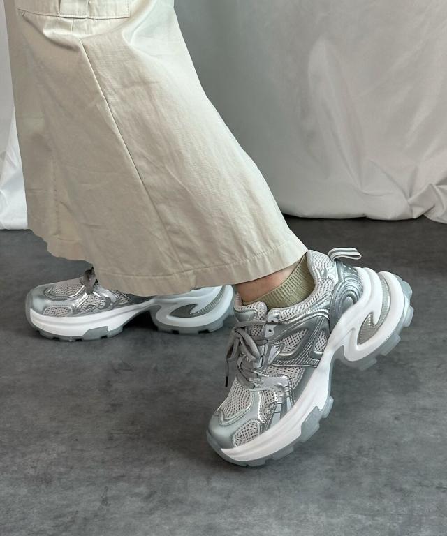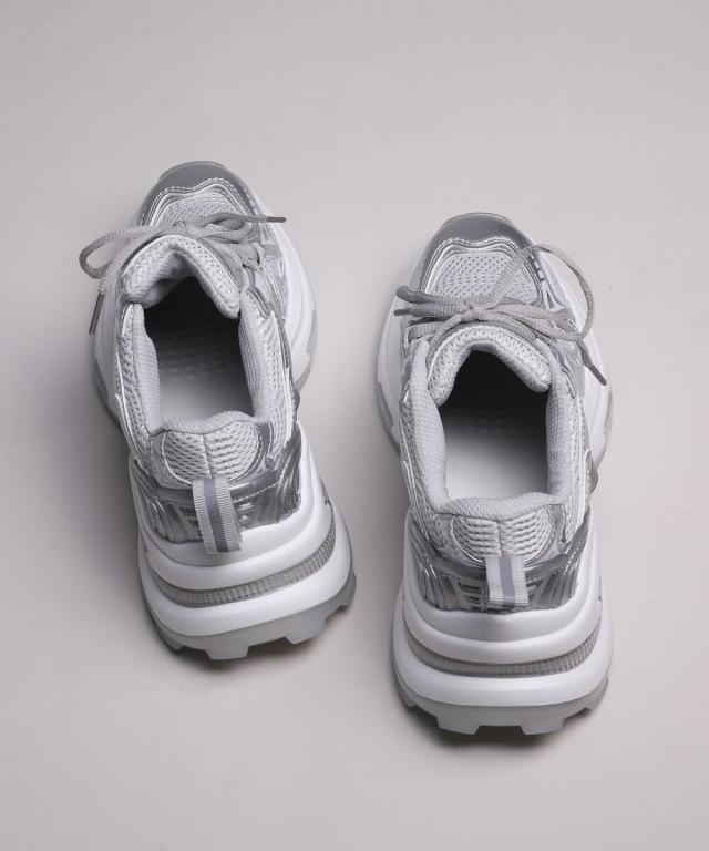 モダンでスタイリッシュなデザインが特徴です。メッシュと合成素材の組み合わせが、軽やかでスタイリッシュな印象を与えます。6.3センチのエアクッションの厚底デザインで脚長効果アップ。白と銀色の2色展開。クリーンなラインとディテールにこだわったデザインが、どんなコーディネートにも合わせやすいです。
