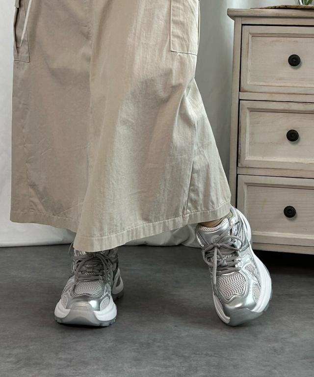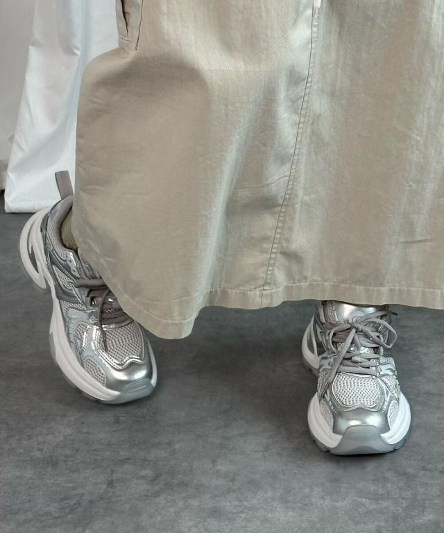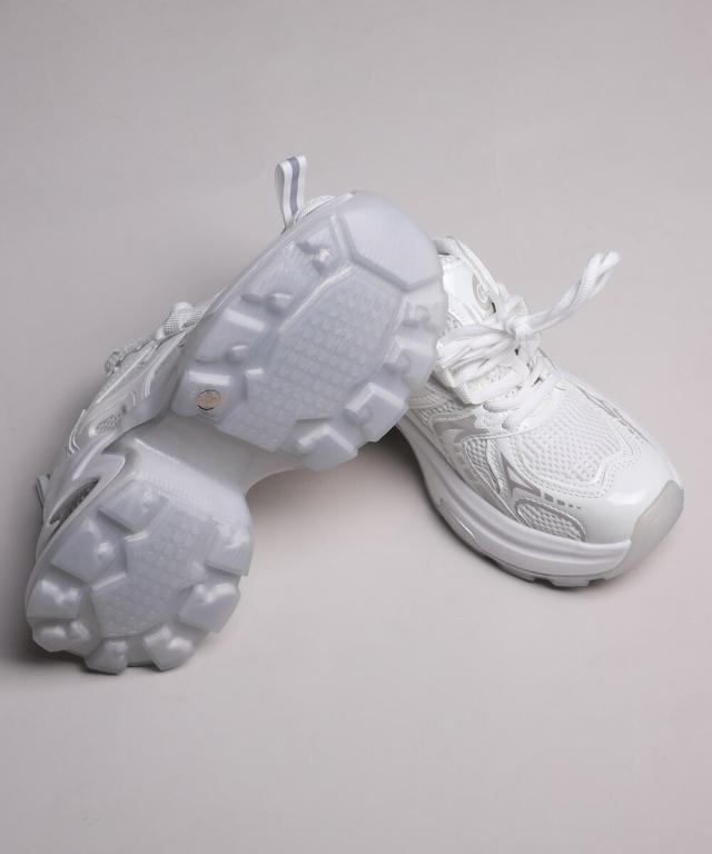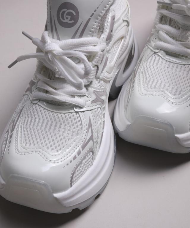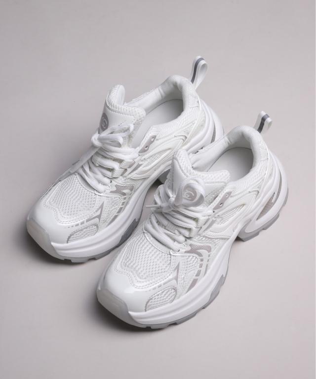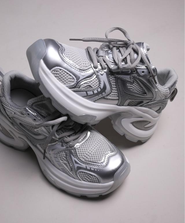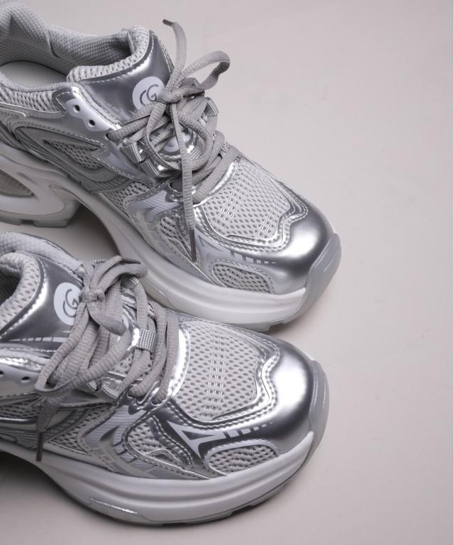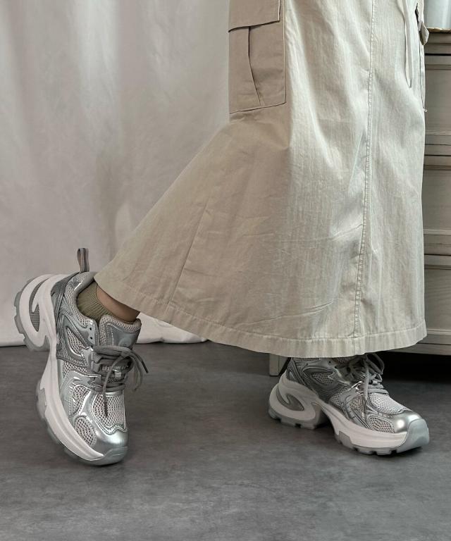 モダンでスタイリッシュなデザインが特徴です。メッシュと合成素材の組み合わせが、軽やかでスタイリッシュな印象を与えます。6.3センチのエアクッションの厚底デザインで脚長効果アップ。白と銀色の2色展開。クリーンなラインとディテールにこだわったデザインが、どんなコーディネートにも合わせやすいです。