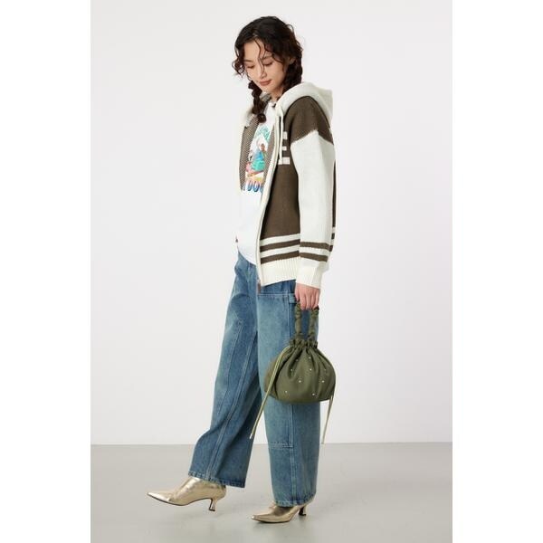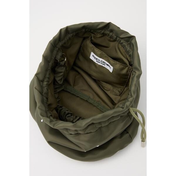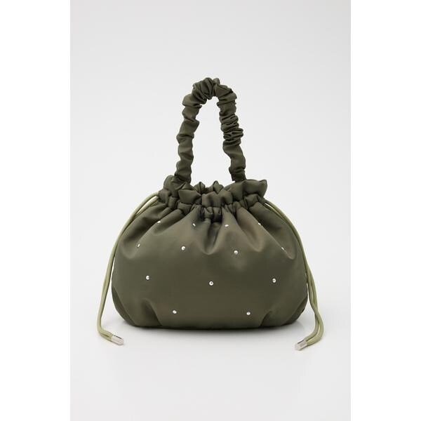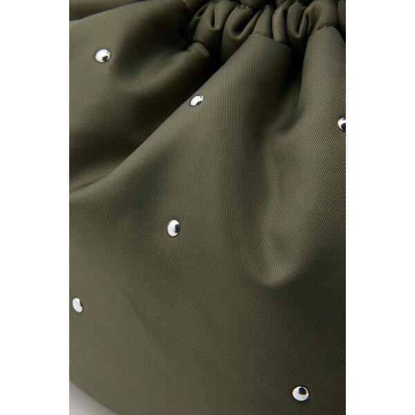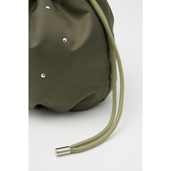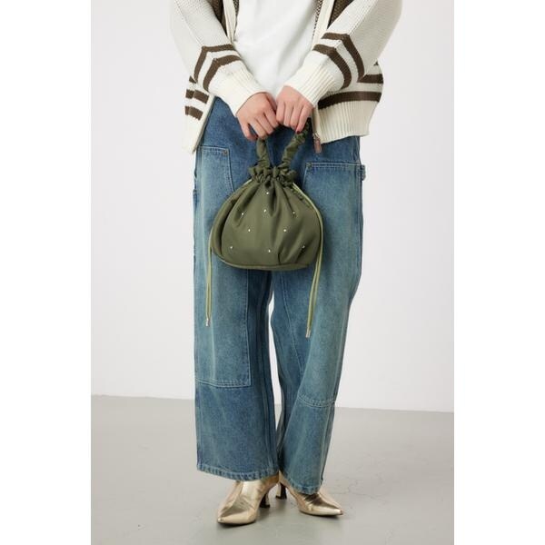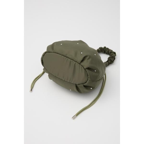 遊び心のあるスタッズがアクセントになった巾着型ショルダーバッグ。やや光沢感のある厚手のナイロン生地に、クールな半ドーム型のスタッズが上品な印象に。小ぶりなデザインで、ちょっとしたお出かけや、サブバッグとしてもおすすめ。くしゅくしゅした持ち手もポイントで、取り外し可能なショルダー付きです。ショルダーバッグにする際は、ハンドルを中に収納してコンパクトにするのがイチオシです。※スタッズは手作業で付けているので、1点1点多少の個体差がございます。予めご了承ください。