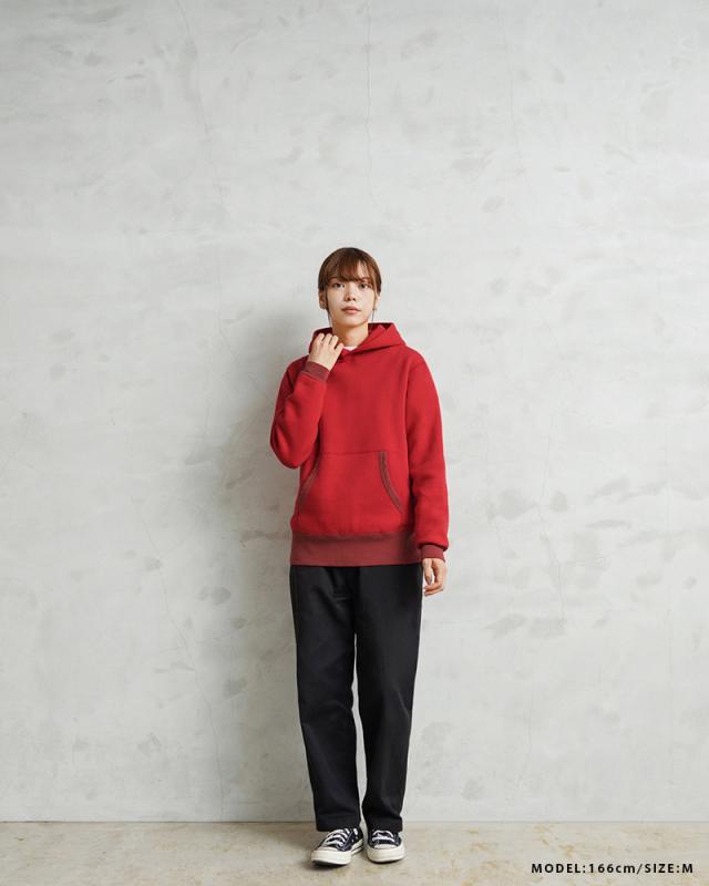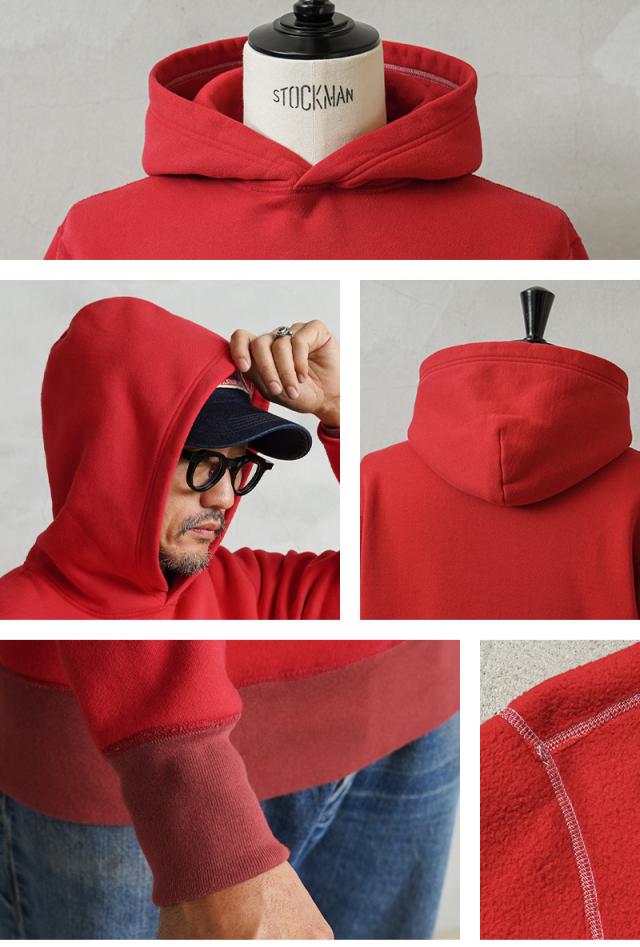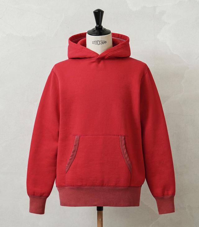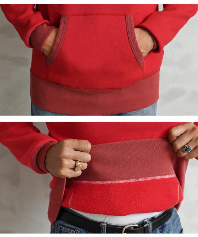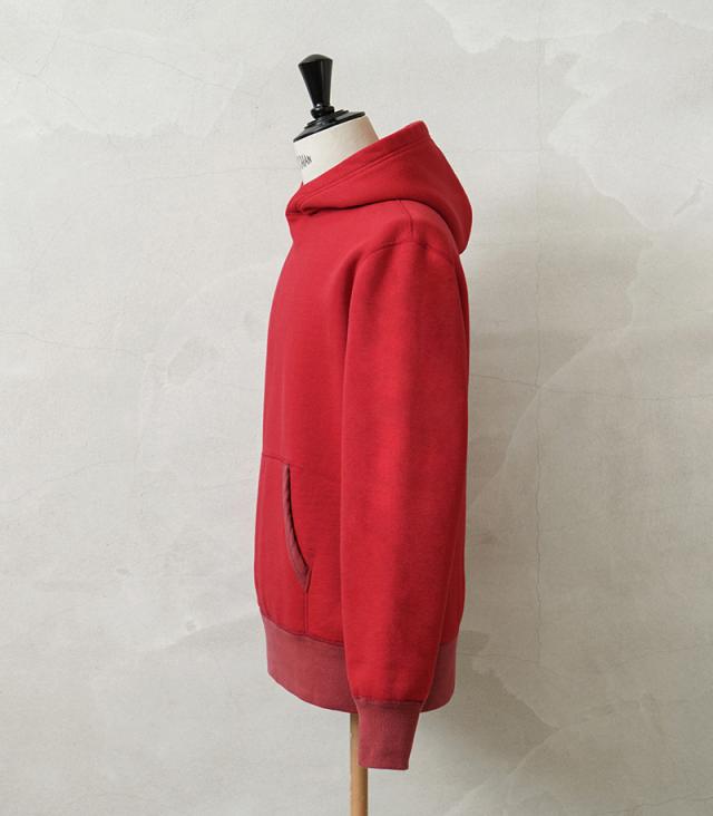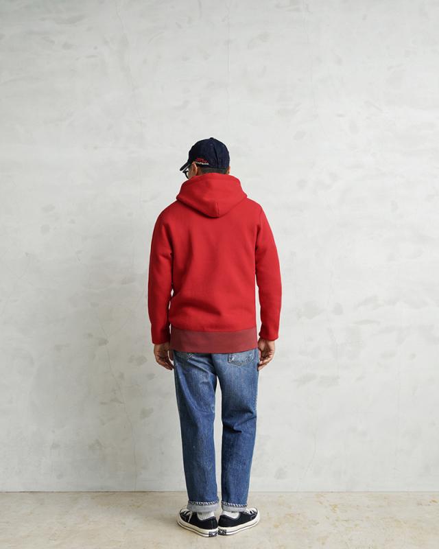 飽きが来ないデザインと研究されたパターンによって、コシのある立体的なシルエットのフードを実現。袖や裾、カンガルーポケットの両端のリブ部分は染料の濃度を変えることによって、絶妙な色合いの変化をつけているのもポイント。