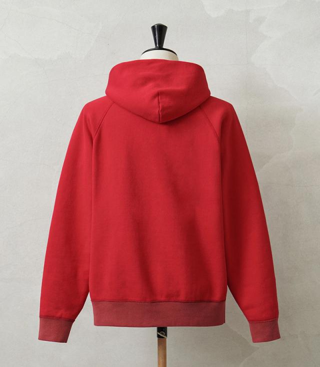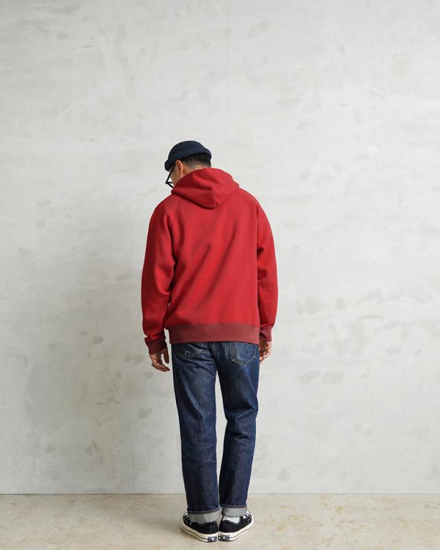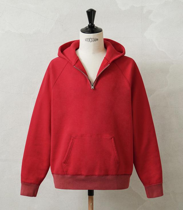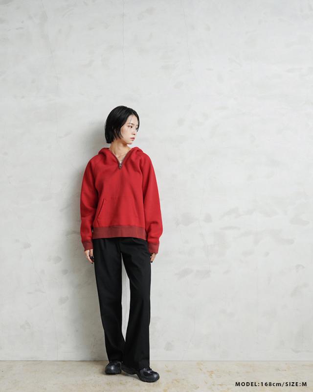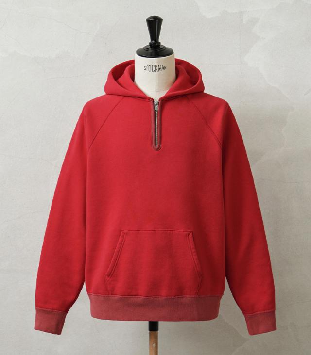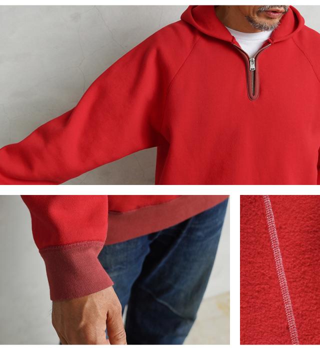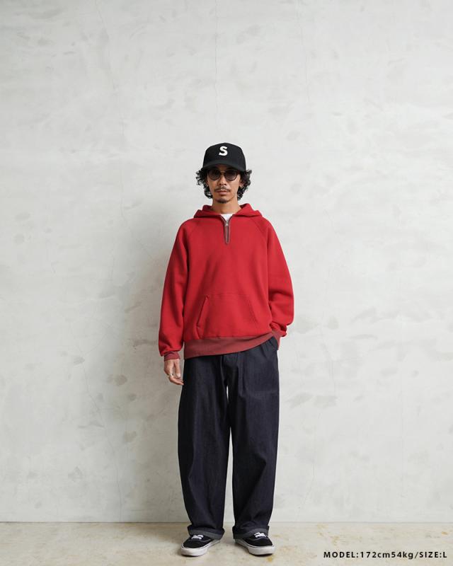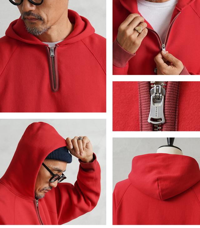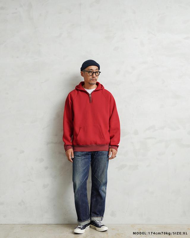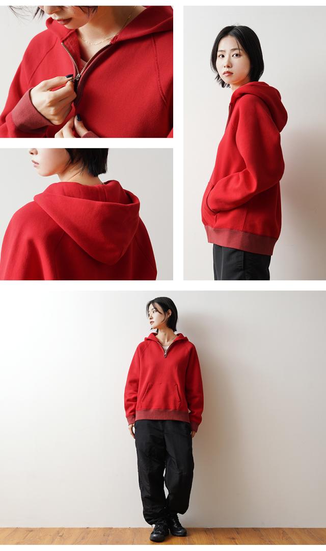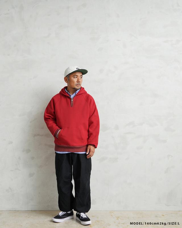 大きめに取られたラグランスリーブ、やや短めの着丈のボックスシルエットで、着脱しやすいハーフジップデザイン。アクセントとなるカンガルーポケットや着用した時の立ち上がりが良いフード部分など、トレンドも意識しつつカジュアルアイテムとして定番のディテールが詰め込まれています。
