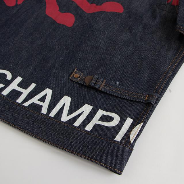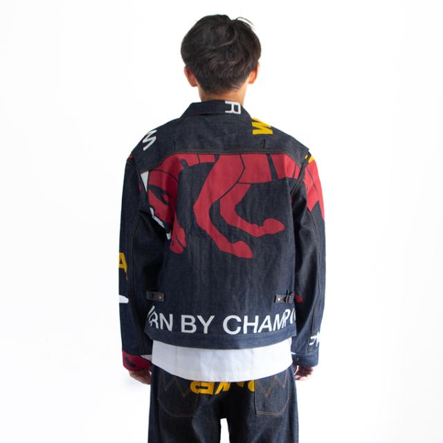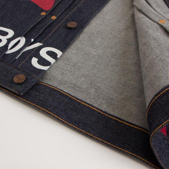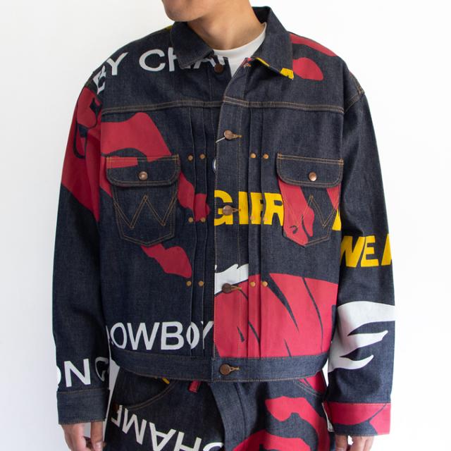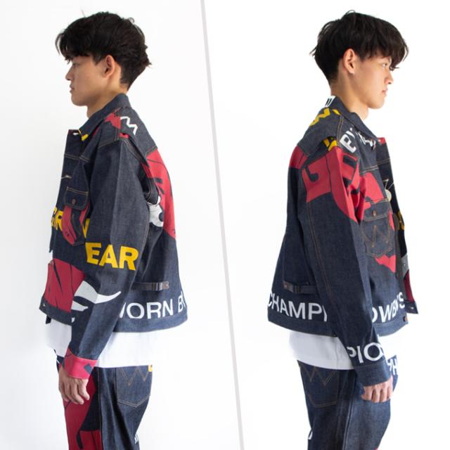 デニムバナーのデザインをプリントした生地を作成し、そのままジャケットに落とし込み、スペシャルな「111MJ」デニムジャケットを制作。バナープリント生地をそのまま裁断・縫製しているので1つ1つプリントの出方が異なるのもこの商品ならではのスペシャル仕様。フィットはややルーズめへリサイズしているので、トレンドのオーバーサイズ仕様。