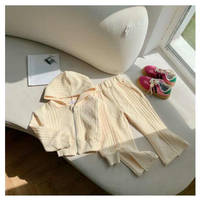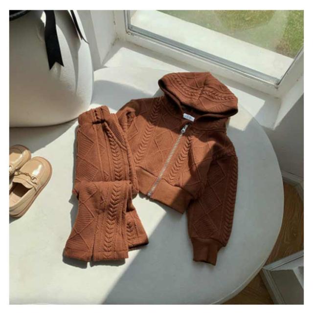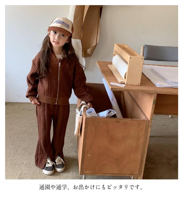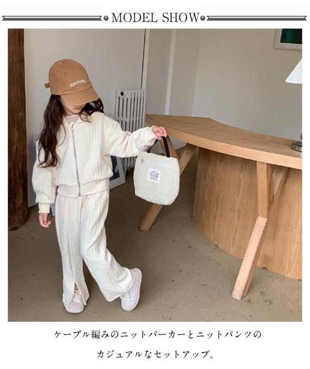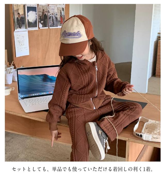 | 【女の子ニットセットアップ】 【90〜150cm】【全4色】 ケーブル編みのニットパーカーとニットパンツのカジュアルなセットアップ。 暖かみのあるニット素材のワイドパンツは履き心地抜群。裾フロントに施したスリットがアクセントになります。 セットとしても、単品でも使っていただける着回しの利く1着。 通園や通学、お出かけにもピッタリです。 | |