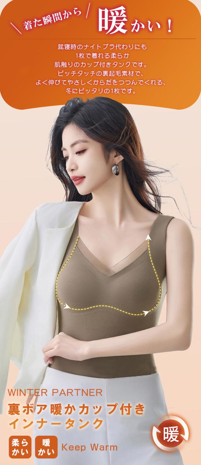 着た瞬間から暖かい! 就寝時のナイトブラ代わりにも 1枚で着れる柔らか肌触りのカップ付きタンクです。 ピッチタッチの裏ボア素材で、 よく伸びてやさしくからだをつつんでくれる、 冬にピッタリの1枚です。 ※モニター環境により多少色合いが異なりますので、予めご了承くださいませ。 |