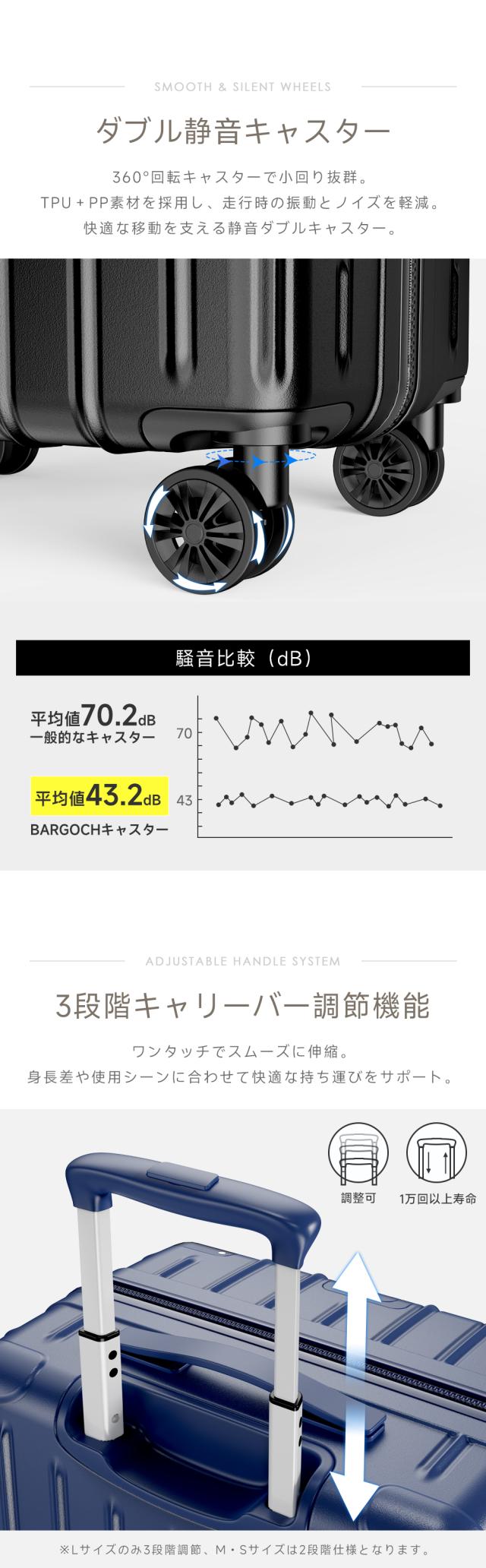 自社開発した高弾性TPE衝撃軽減素材のキャスターを採用し、より静かで耐摩耗性も向上しています。360度回転8輪ダブルキャスター搭載、静音設計と耐久性抜群のキャスターで、凸凹路面で、重い荷物でもスムーズで安定した走りを可能に。