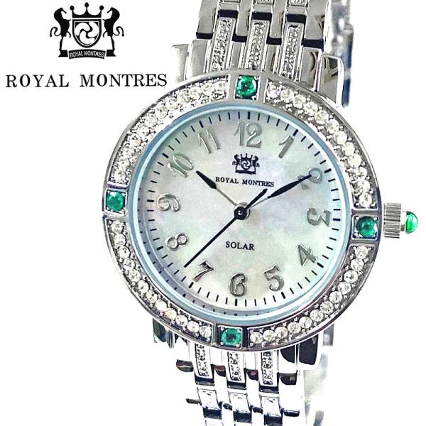 ROYAL MONTRES エメラルド天然石 ソーラー腕時計 RM-0015-SVEL レディース 宝石鑑別書付 日常防水 白蝶貝文字盤 クリスタル48石 ロイヤルモントレス