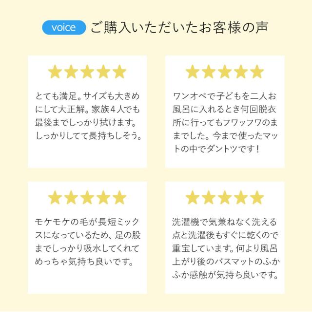 お風呂の順番が3人目や4人目になってもサラサラ、ふわふわの踏み心地で快適です。その秘密は、SUSU独自のマイクロファイバーモール。蒸発スピードが速く、繊維の内側まで水を吸い込んでから拡散させるので、マットの表面が長く濡れたままということがありません。