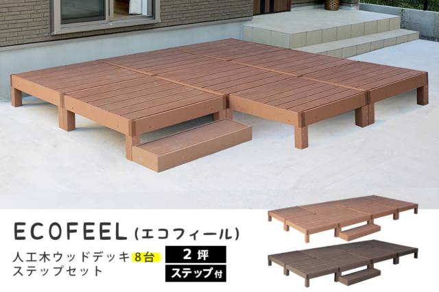 人工木ウッドデッキ ecofeel エコフィール 8台 ステップセット 2坪 ( ガーデンデッキ 人工木デッキ 人工木 DIY 縁台 ぬれ縁 90×90cm セット 掃き出し窓 連結 人工木材 バルコニー 庭 エクステリア 外構 簡単 )