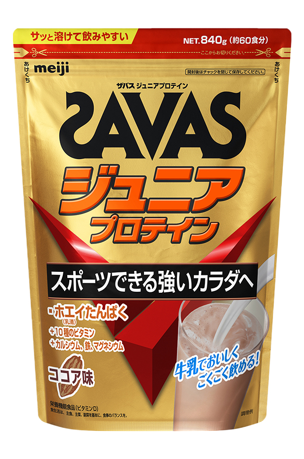 | ザバス ジュニア プロテイン ココア味は、スポーツジュニアが食事などで不足しがちな栄養素を理想的に補えるプロテインです。 スポーツできる強いカラダづくりと成長のために、たんぱく質は摂りたい成分の1つです。たんぱく質として、牛乳生まれのホエイ(乳清)プロテインを配合しました。 「10種のビタミン+カルシウム+鉄+マグネシウム」配合。食事・間食だけでは不足しがちな栄養素を理想的に補えるよう設計しています。 ※「ザバス ジュニアプロテイン」は、明治が実施したスポーツジュニアの食事調査結果に基づき、スポーツジュニアのカラダづくりに必要とされるビタミン、ミネラルを独自に設計して配合しています。 栄養機能食品(ビタミンD) ビタミンDは、腸管でのカルシウムの吸収を促進し、骨の形成を助ける栄養素です。 ※1日当たりの摂取目安量(28g)の栄養素等表示基準値(18歳以上、基準熱量2,200kcal)に占める割合:ビタミンD54% スポーツジュニアの風味調査を重ねて決定した、おいしく飲みやすいココア味です。運動後だけでなく、朝食時やおやつとしても、牛乳や水でおいしく召し上がれます。 アンチ・ドーピング認証「インフォームドチョイス」を取得。 |