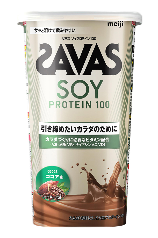 | ザバス ソイプロテイン100 ココア味は、たんぱく原料として、引き締まったカラダづくりをサポートする「大豆プロテイン」を100%使用しています。トレーニング直後などのプロテイン摂取ポイントに合わせてたんぱく質を補給できるので、理想的なカラダづくりをサポートします。 カラダづくりに欠かせない「ビタミンB群・ビタミンD」、体調維持に欠かせない「ビタミンC」を配合しています。 ※「ザバス ソイプロテイン100」は、明治が実施したアスリートの食事調査結果に基づき、アスリートのカラダづくりに必要とされるビタミンを独自に設計して配合しています。 独自の造粒方法や配合で、プロテインの溶けやすさを追求しています。溶けやすいのでシェイカーだけでなく、グラスやコップでも簡単に溶かせておいしくお飲みいただけます。 大豆の香ばしさが感じられる、水でもおいしく飲みやすい定番のココア味です。牛乳で溶かせば、程よい甘さのミルクココアのように召し上がれます。ココア感がアップしました。 |