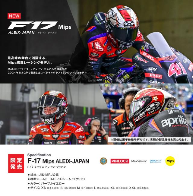 【商品紹介】最新の空力技術を採用したフラッグシップモデル「F-17(エフ・イチナナ)」より、MotoGPライダーのアレイシ・エスパルガロ選手が2024年の日本GPで着用したスペシャルグラフィックのレプリカモデル「F-17 Mips ALEIX-JAPAN(エフ・イチナナ ミップス アレイシ・ジャパン)」を数量限定で登場!