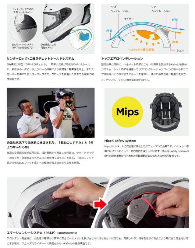 □ アクシデント発生時に簡単かつ素早く安全にヘルメットを脱がせるKabutoの独自構造のエマージェンシーシステム(PAT.P)。