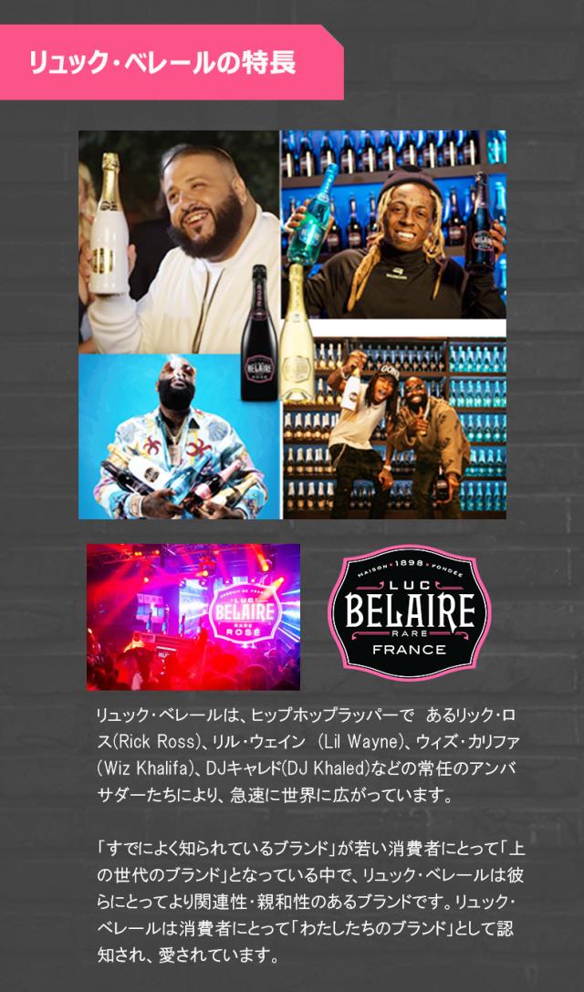 米国で最も売れているプレミアムスパークリングロゼワイン!シーンを問わずに愉しめ、エレガンスでアイコニックなスタイルによりリュック・ベレールのリュック・ベレール・レア・ロゼは米国で最も売れているプレミアムスパークリングロゼワインに選ばれています!! 家族経営の成しえる力! 100%フランス産のブドウを使用して造られるリュック・ベレール!!リュック・ベレールは、家族経営のメゾンでしか見られない職人技を組み合わせて造られています!!リュック・ベレールは人気ヒップホップラッパーのリック・ロス(Rick Ross)、リル・ウェイン(Lil Wayne)、ウィズ・カリファ(Wiz Khalifa)やDJ キャレド(DJ Khaled)などの常任アンバサダーたちにより、世界各国の若い世代に愛飲者が拡大しています!! |