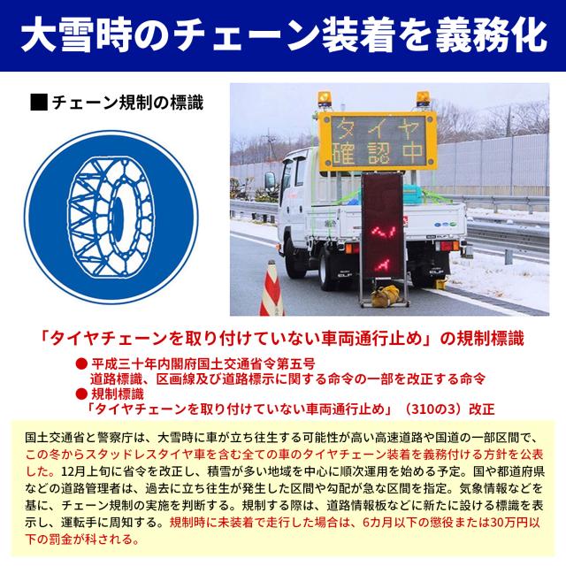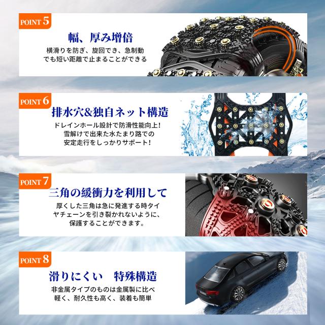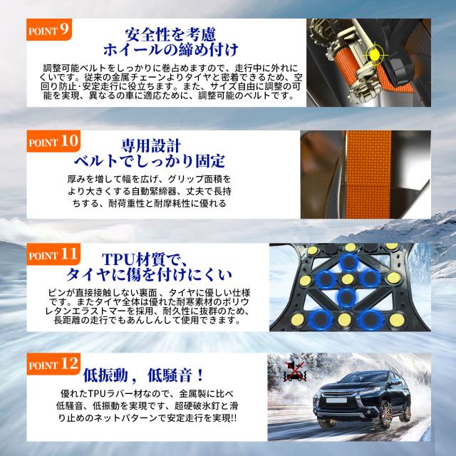 - 装着はとても簡単で、ジャッキアップ不要なのが便利です。初めて使用する人でも、説明書を見ながらスムーズに取り付けられると思います。雪道や凍結路面でのグリップ力も高く、しっかりと滑り止めの効果を発揮してく...