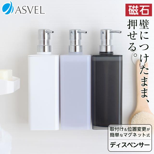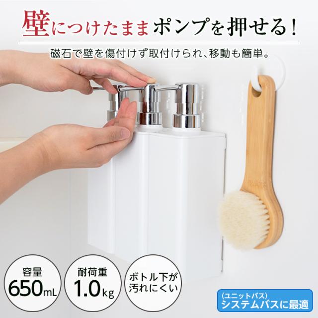 システムバスの壁面に最適♪マグネットの力で壁につけれるディスペンサー登場。浮かせて設置するので容器の底が汚れにくい製品です。650mlの容量で袋のままでも使える便利アイテム!※容量400ml以下の詰替え用製品まで想定※中身がわかりやすい専用インデックスシール付きカラーホワイト クリアホワイト グレー※ホワイトのみお届け時のパッケージ形態が異なります。容量 : 650mLサイズ : 幅7.4×奥行9.1×高さ24.3cm材 質本体:AS樹脂/ラバーマグネットフタ:AS樹脂パッキン:シリコーンゴムすべり止め:ポリウレタンポンプ:ABS樹脂(クロームメッキ)/PP/ステンレス鋼/発泡PE