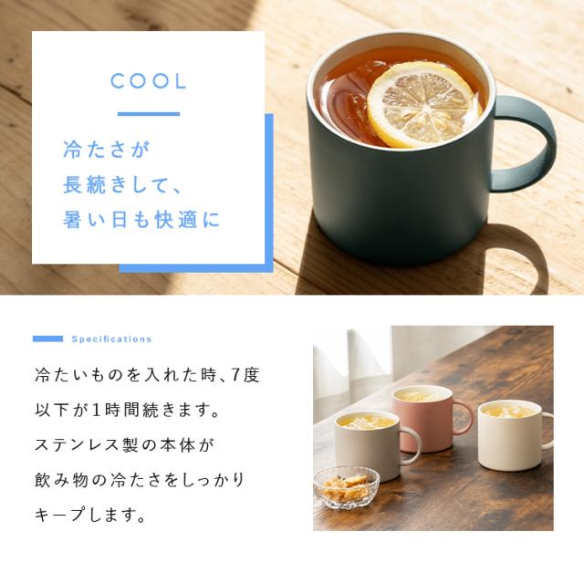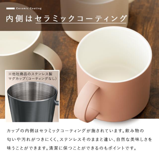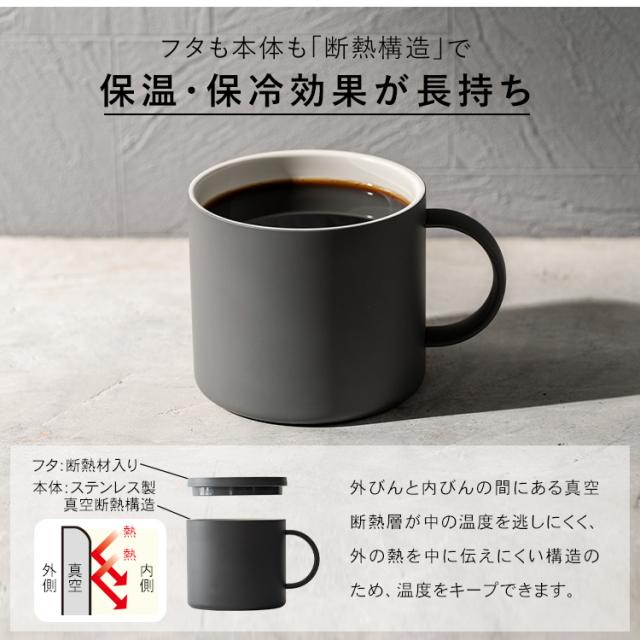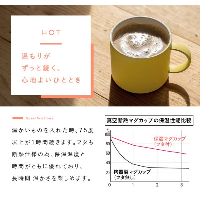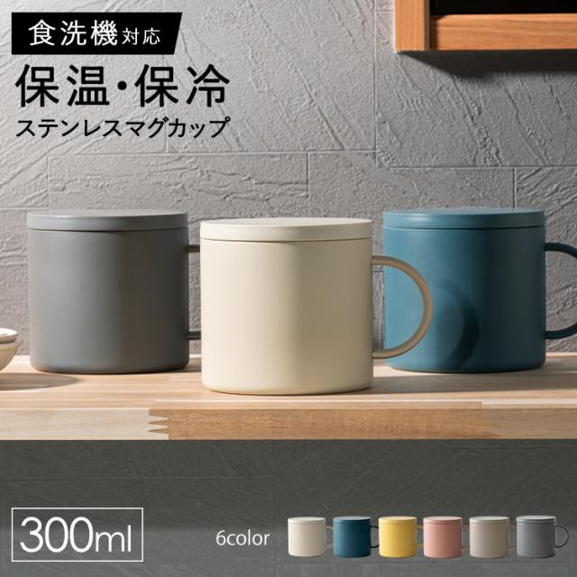 温かい珈琲や紅茶を、美味しく飲める「保温マグ」。ステンレス真空断熱構造で、温かさが長持ち。仕事中のオフィスはもちろん、自宅のリビングのカフェタイムにも最適です。断熱構造だから、結露せず、また容器が熱くなりません。フタにも断熱材入りで温かさが長持ちする優れものです。汚れがつきにくい内面セラミック加工。フタ・本体とも食洗機対応でお手入れも簡単。コンビニコーヒー1.5杯分入る、少し大きめの300mlサイズ。選べる6カラーでギフトにもぴったりの一品です。容量 : 300mlサイズ : 幅12.1×奥行9.1×高さ8.8cm材質 : 本体内側=ステンレス鋼(セラミックコーティング) 本体外側=ステンレス鋼(アクリル樹脂塗装) フタ=PP(発泡PP断熱材)