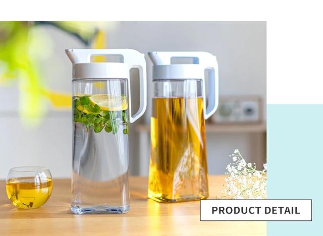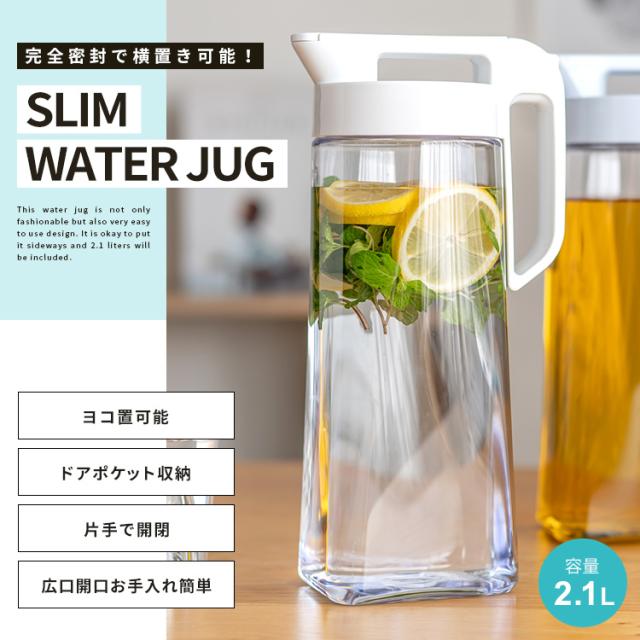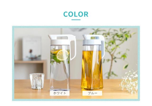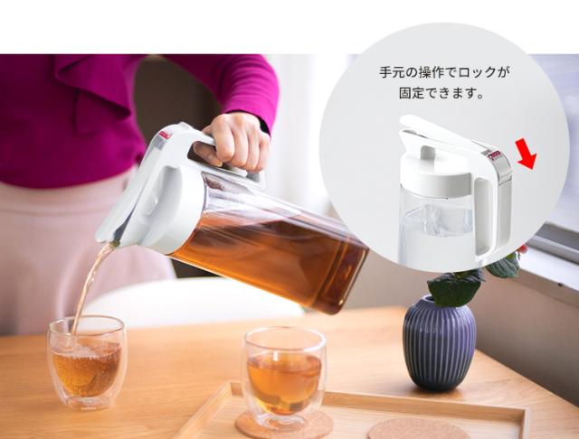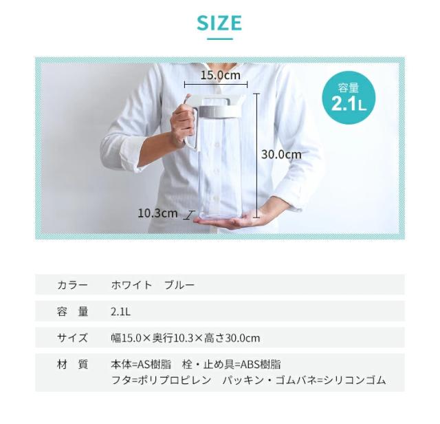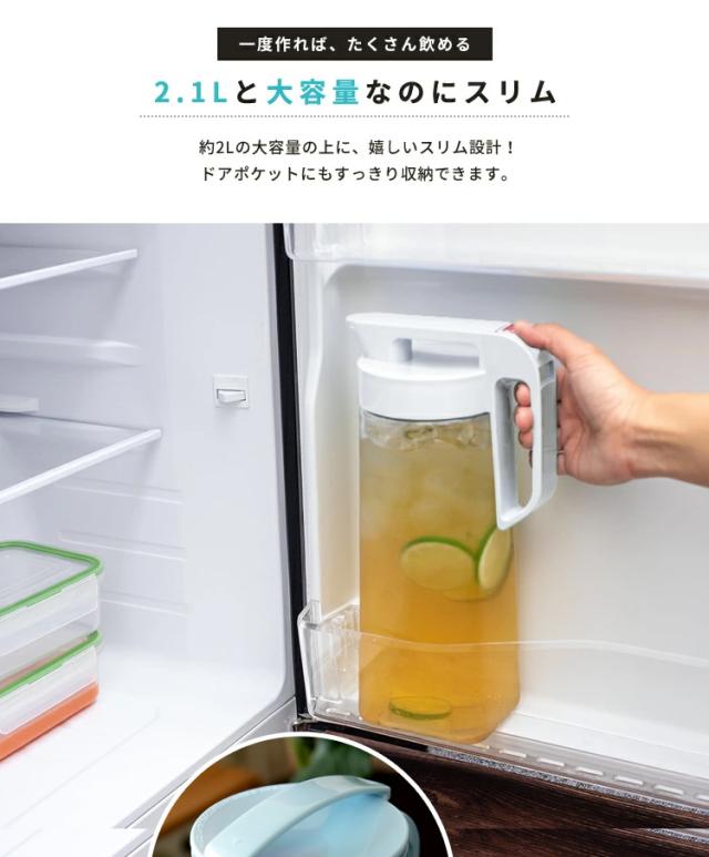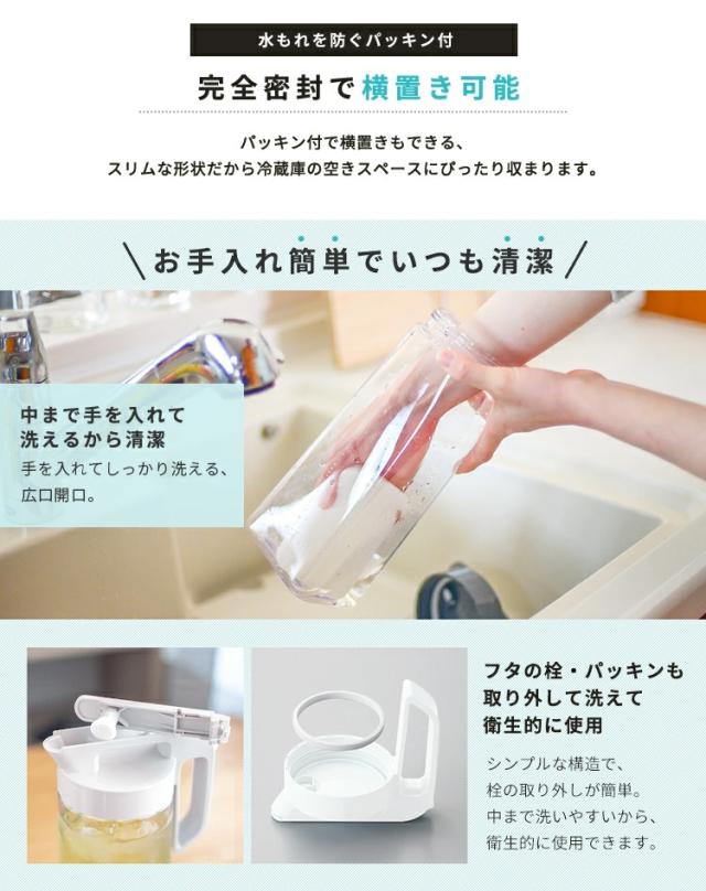 水漏れを防ぐパッキン付き。完全密封で横置き可能、片手操作のワンプッシュ冷水筒「ドリンクビオ」。片手ワンプッシュで操作できるので、簡単に開閉。ハンドルを持ちながら、手元で操作できます。完全密閉で寝かしても漏れないから、冷蔵庫でも横置きできます。冷蔵庫の前ドアポケットに入る設計。上部持ち手付きなので、野菜室に入れても取り出しやすい。また耐熱仕様で、麦茶などの煮出しも可能。中まで手を入れられる広口設計なので、しっかり洗えて清潔。お子さんがいる家庭などファミリーに2.0リットルサイズです。容量 : 2.0リットルサイズ : 幅15.0×奥行10.3×高さ30.0cm材質 : 本体=AS樹脂 栓・止め具=ABS樹脂 フタ=ポリプロピレン パッキン・ゴムバネ=シリコンゴム日本製