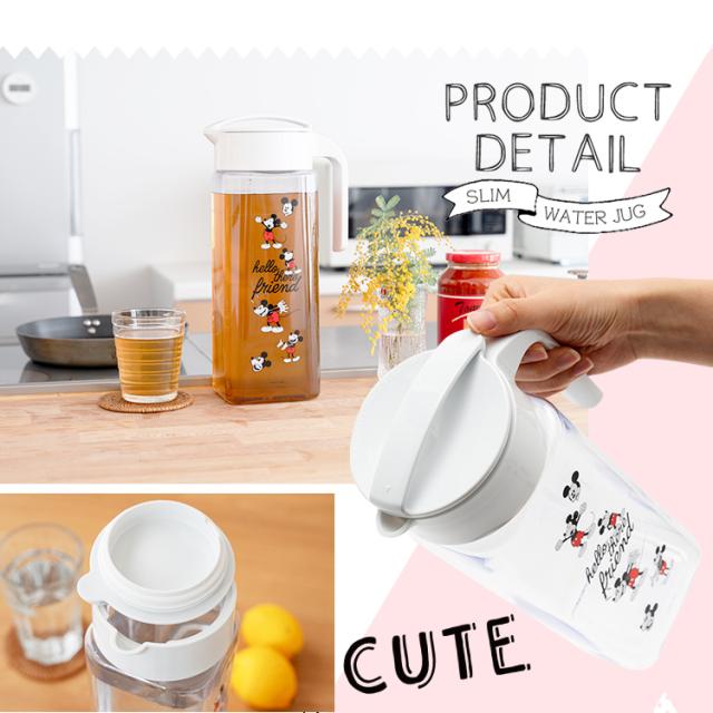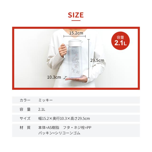 【2本セットのページです】ミッキー冷水筒に新しいデザインが仲間入り♪水漏れを防ぐパッキン付き。完全密閉で寝かしても漏れないから、冷蔵庫でも横置きできます。また耐熱仕様で、麦茶などの煮出しも可能。無駄のないスクエア形状で、ドアポケットにもすっきり収納でき、横置きしても場所をとらず、冷蔵庫の空きスペースを有効活用できます。中まで手を入れられる広口設計なので、しっかり洗えて清潔。手にフィットするカーブが握りやすい形状で、片手でも使いやすいスタイリッシュなデザイン。冷蔵庫の収納にお困りの方にはぴったり。ファミリーサイズの2.0リットルです。容量 : 2.0kgサイズ : 幅15.2×奥行10.3×高さ29.5cm材質 : 本体=AS樹脂、フタ・ネジ栓=PP、パッキン=シリコーンゴム