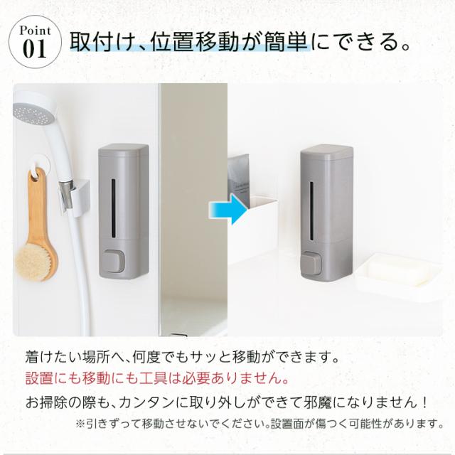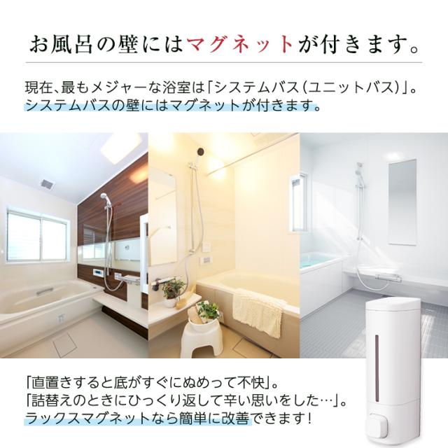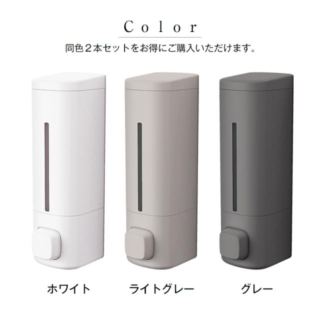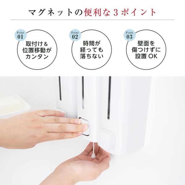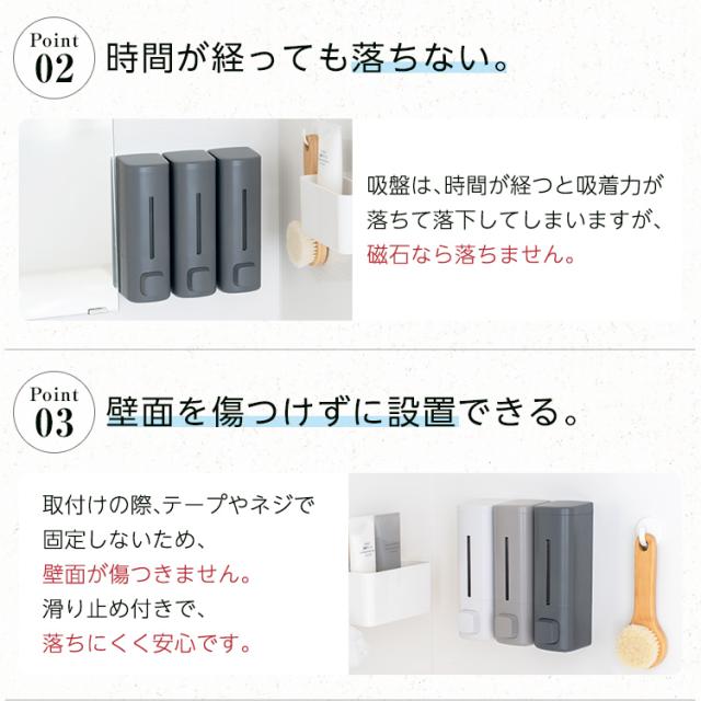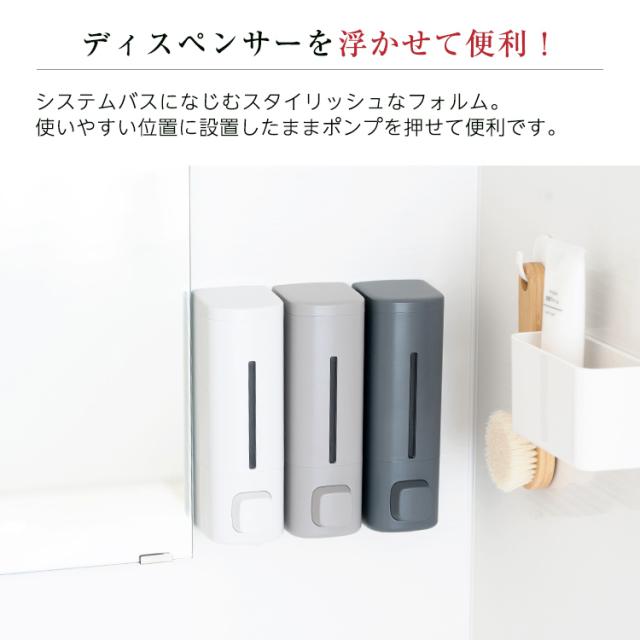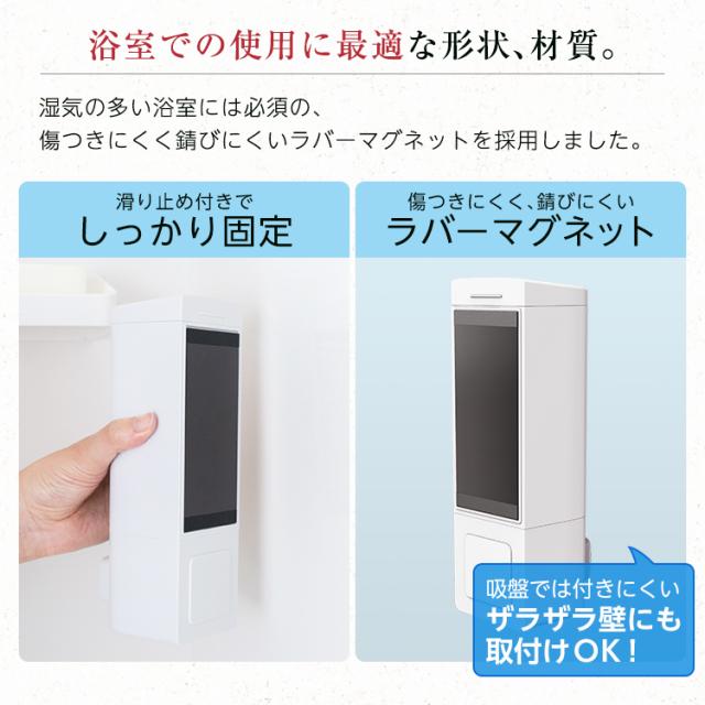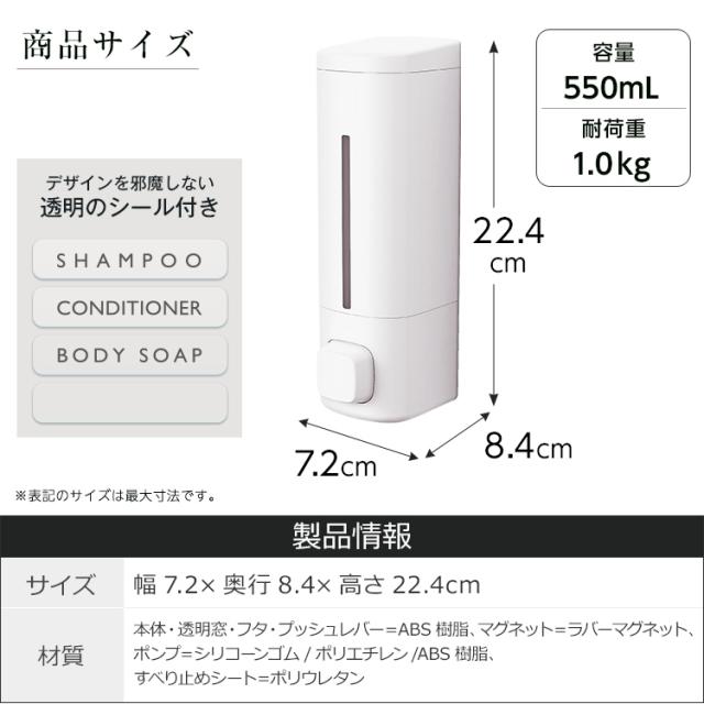 システムバスの壁面に最適♪マグネットの力で壁につけれるディスペンサー登場。浮かせて設置するので容器の底が汚れにくい製品です。プッシュ式のホテルライクなアイテムです!中身がわかりやすい専用インデックスシール付き「2本セット」の販売ページです。カラーホワイト ライトグレー グレー容量 : 550mLサイズ : 幅7.2×奥行8.4×高さ22.4cm材 質本体・透明窓・フタ・プッシュレバー:ABS樹脂マグネット:ラバーマグネットポンプ:シリコーンゴム/ポリエチレン/ABS樹脂すべり止め:ポリウレタン