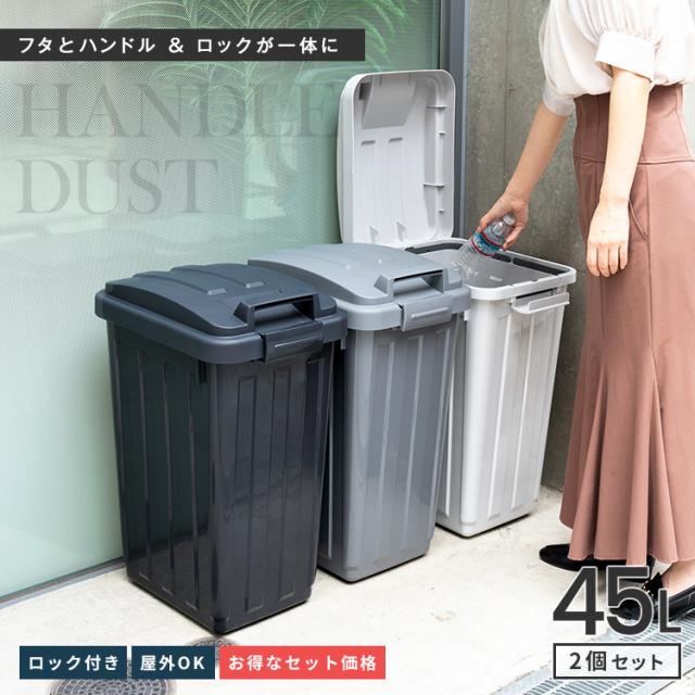 屋内屋外問わず活躍するゴミ箱 ハンドル付ダストボックス 45リットル 。開け閉めしやすい大きなハンドルが特徴です。倒しても中身がこぼれないロック付きなので、犬猫対策、カラス対策や小さなお子様のいたずら対策に最適。袋止め付きで、市販の45リットル のゴミ袋が使えます。フタは開いた状態で固定できるので、ゴミ袋交換もラクラク。フタのカラーを組み合わせれば、ペットボトルや空き缶などの資源ごみの分別にも最適。ファミリーからカフェなどの店舗・オフィスまで使える便利な大容量サイズ。(2個セットの販売ページです)容量 : 45リットル サイズ : 幅32.0×奥行42.3×高さ64.5cm材質 : 本体・フタ・止め具・ポリ袋止め=ポリプロピレン日本製
