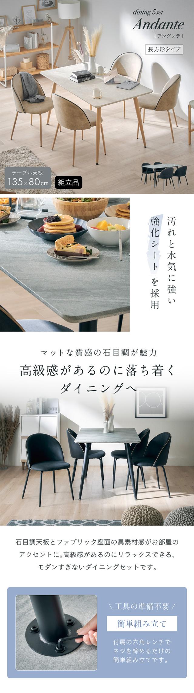 ダイニングセット ダイニングテーブル 四角テーブル 角形テーブル スクエア型テーブル ダイニングチェア 4人掛け おしゃれ シンプル 北欧 ナチュラル Andante(アンダンテ) 5点セット 角形タイプ 幅135cm 2色対応