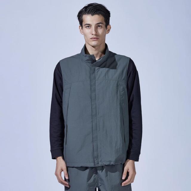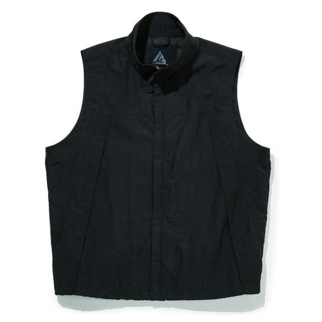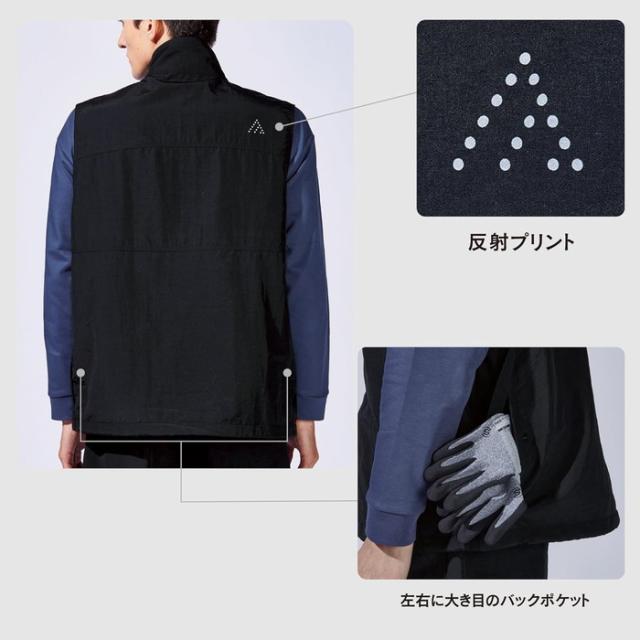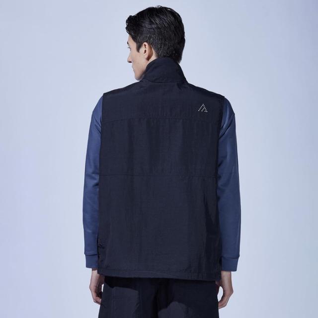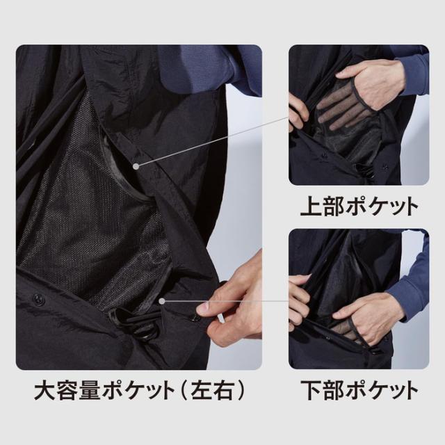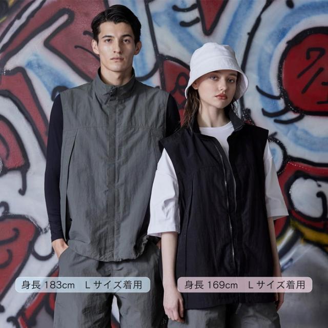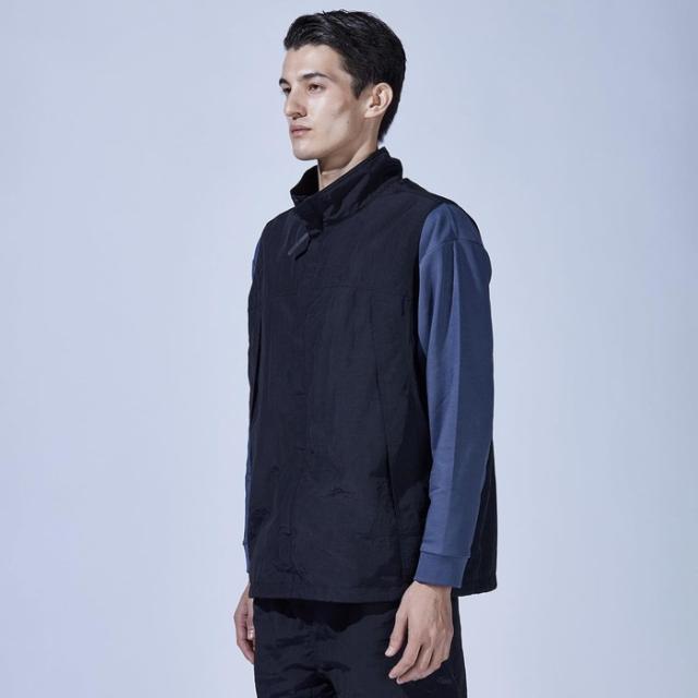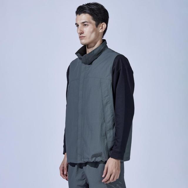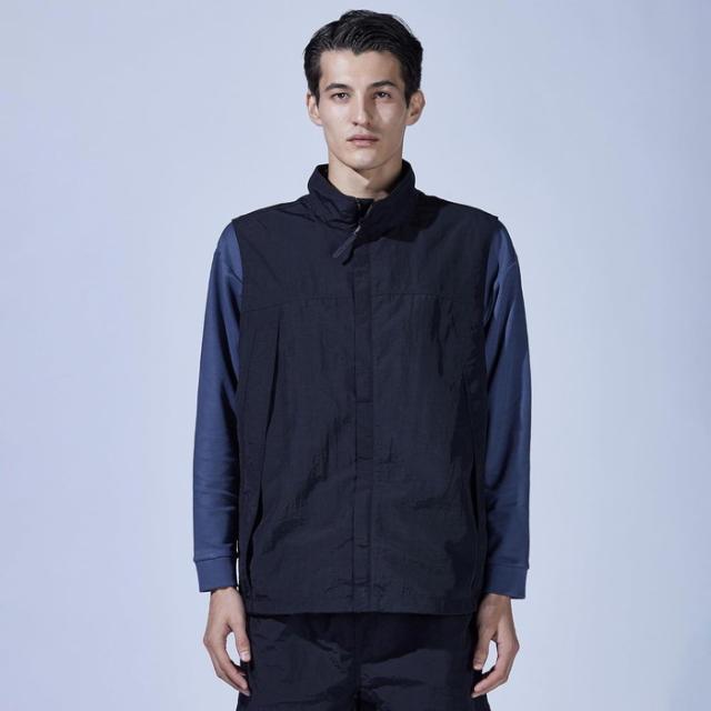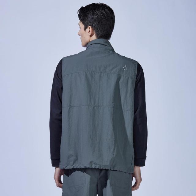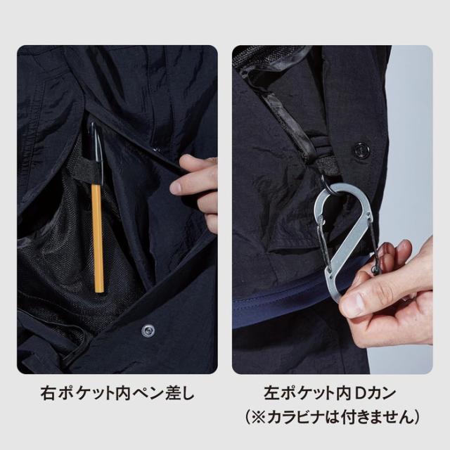 ミニマルでスタイリッシュなデザインを保ちながら9つのポケットを有し、さらにペン差しやD環などワークやアウトドアシーンで役立つギミックが満載。裾部分のドローコードを絞ればシルエットのアレンジが可能。4サイズの大きなポケットの中に、メッシュベストを上下に分けて配置。