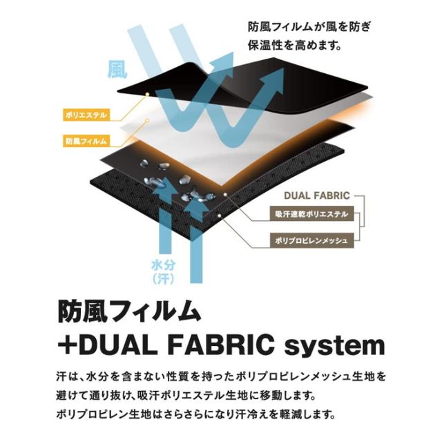 防風フィルム+デュアルファブリック生地と、2WAYストレッチ生地を組み合わせた縫製パターンが動きやすさと防風性能を両立しました。