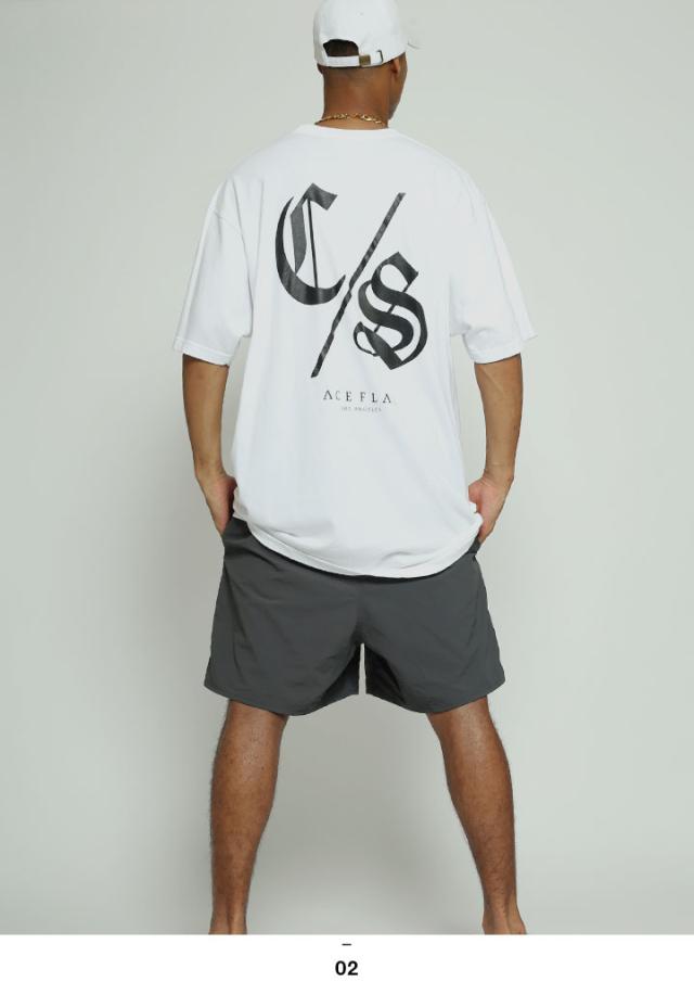 神のご加護を意味する「C/S」ロゴをドロップしたTシャツと「Compton」をドロップしたナイロンハーフパンツの上下セット。