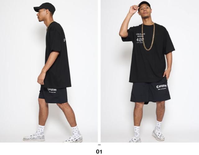 「Fuck the Police/ファック・ザ・ポリス」をドロップしたTシャツと「Compton」をドロップしたナイロンハーフパンツの上下セット。