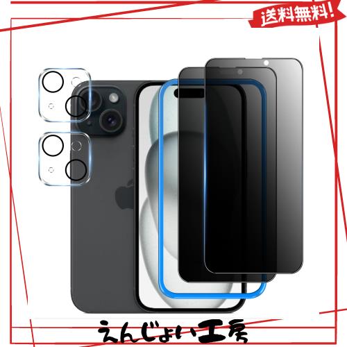 【覗き見防止】 iPhone15 用 ガラスフィルム 覗き見防止 【2枚】+ iPhone15 用 カメラフィルム 【2枚】 【ガイド枠付き】 iPhone15 用