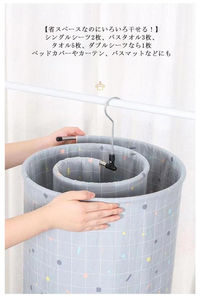 | 【大きな洗濯物を省スペースで干せる!】 お部屋やベランダを有効活用できる! こんな場所で大活躍! 狭いベランダや部屋干し、浴室乾燥 【省スペースなのにいろいろ干せる!】 シングルシーツ2枚、バスタオル3枚、タオル5枚、ダブルシーツなら1枚 ベッドカバーやカーテン、バスマットなどにも 【渦巻きの形状と360度回転で、干しやすく乾きやすい】 クルクル回せるから、干しやすく取り込みやすい 風で回転するから、全体が空気や日光に当たり乾きやすい 渦巻きの形状で通気性がよく、乾きやすい 【折りたたみフックで収納もコンパクト】 フック部分を折りたためるので、スリムに収納 ひっかけて収納もできる | |