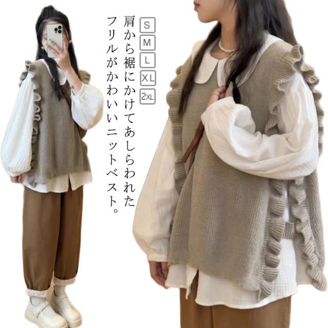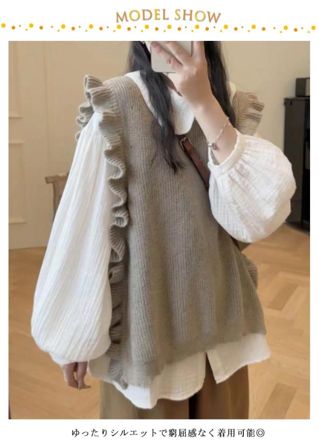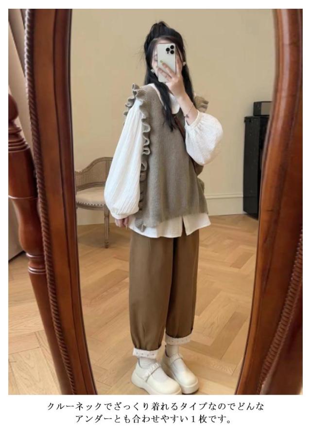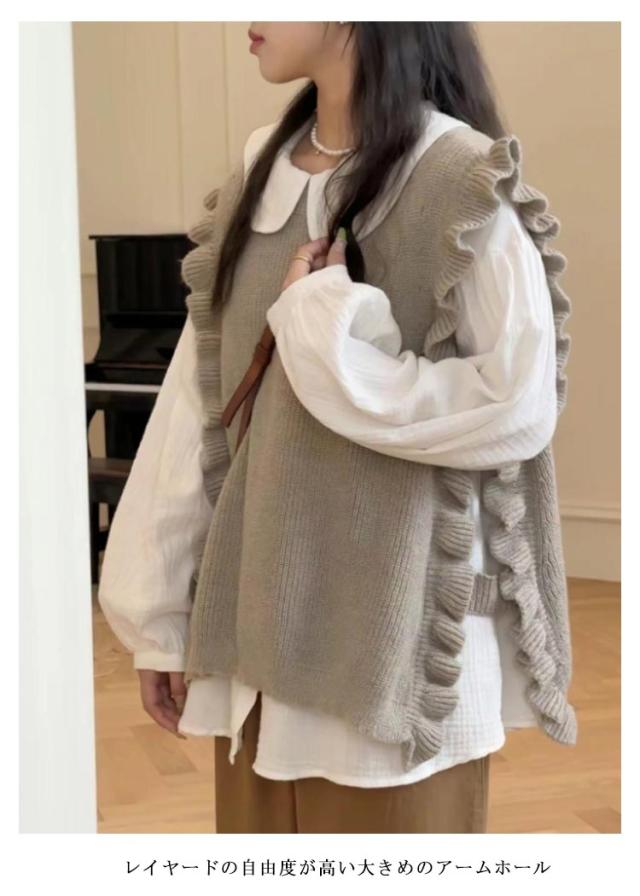 秋冬 肩フリル ベスト ニットトップス プルオーバー プルオーバーニットベスト レイヤード レディース サイドスリット フリル 畦編み ニットベスト 重ね着 ゆったり あったか 大人可愛い ニットベスト おしゃれ 20代 30代 40代 50代 通学 通勤 無地 モカ