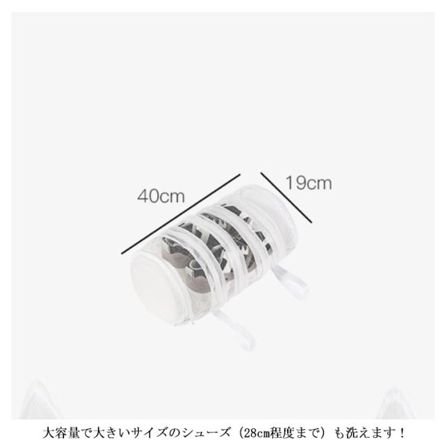 | 円筒型の洗濯ネットでしっかりと汚れを落とす 円筒型の洗濯ネットは、平たい角型に比べ立体的な構造になっているため、 ネットの中で洗濯物が動くので汚れが落ちやすいのが特徴です。 大容量で大きいサイズのシューズ(28cm程度まで)も洗えます! | |