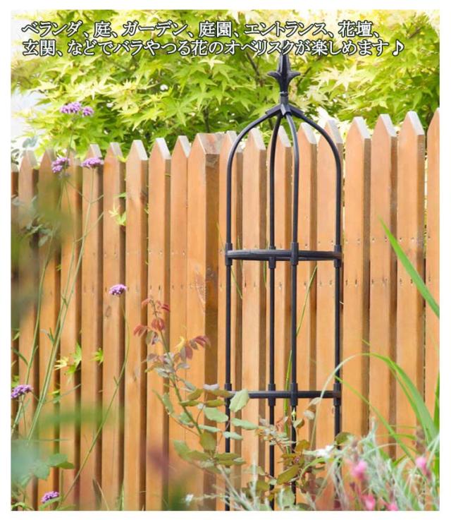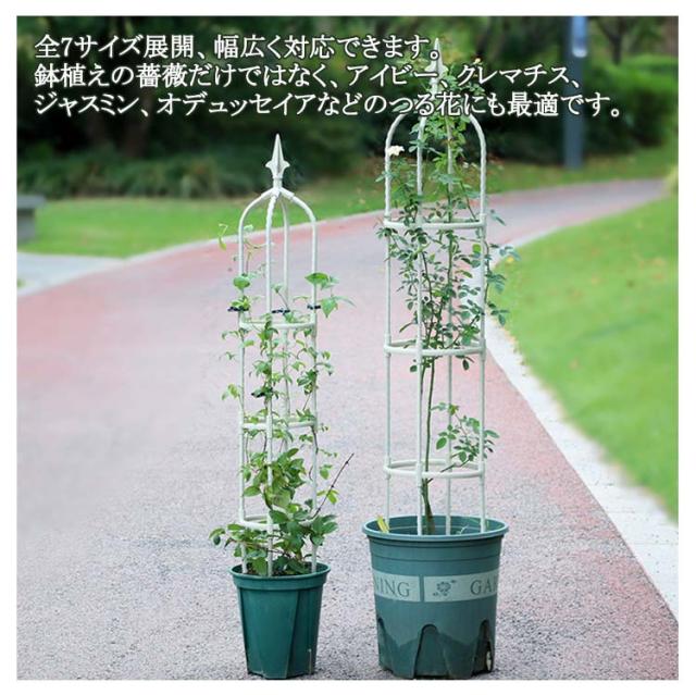 | 魅力的な空間作りに。 鉢植えの薔薇やつるつる性植物を絡ませてお庭に緑と癒しの空間を。 お花を絡ませるだけでより華やかになるオベリスク。 工具いらずで差し込むだけの簡単組み立て。花の成長段階に合わせて、高さを調節することができるの嬉しいポイント。 全7サイズ展開、幅広く対応できます。鉢植えの薔薇だけではなく、アイビー、クレマチス、ジャスミン、オデュッセイアなどのつる花にも最適です。 ポリエチレン被覆鋼管製なので、軽くて丈夫、一人でもしっかり固定もでき安心安全です。 ベランダ、庭、ガーデン、庭園、エントランス、花壇、玄関、などでバラやつる花のオベリスクが楽しめます♪ | |