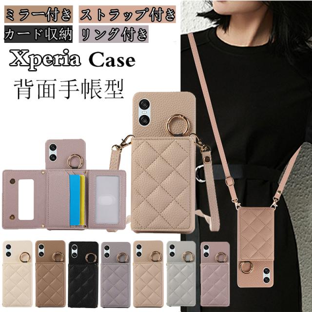 xperia 10vスマホケース ミラー付き SOG14 4つ穴ショルダー 3つ折り エクスペリア 1 10 VII SOG15 5V 10VI 1VI 5V 10V 1V 10IV 5IV 1IV 5III 10III 1III Ace III スマホショルダー カード収納 肩掛け ストラップ付き 携帯ケース 背面手帳型 ミラー 鏡 韓国 かわいい