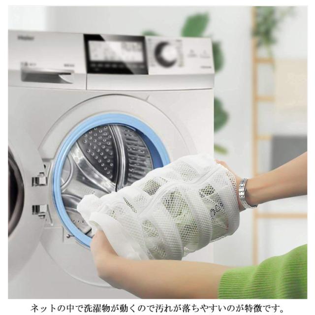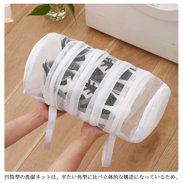 | 円筒型の洗濯ネットでしっかりと汚れを落とす 円筒型の洗濯ネットは、平たい角型に比べ立体的な構造になっているため、 ネットの中で洗濯物が動くので汚れが落ちやすいのが特徴です。 大容量で大きいサイズのシューズ(28cm程度まで)も洗えます! | |
