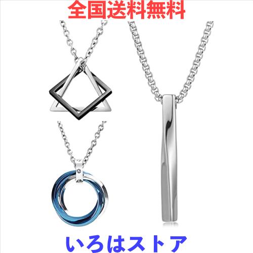 【商品仕様】留め金具:引き輪タイプ固定、長さ55cm、幅3mm、幾何学デザイン、円形デザインとステックデザイン各一本、合計で3本入りのネックレスセットです。服装やニーズによって交換して使ったり、家族と一緒に使ったりできます。シンプルなコーデにネックレスを主役にさせることで、よりあか抜けた雰囲気に。丁度いいサイズ感、日常の服によく合わせます。