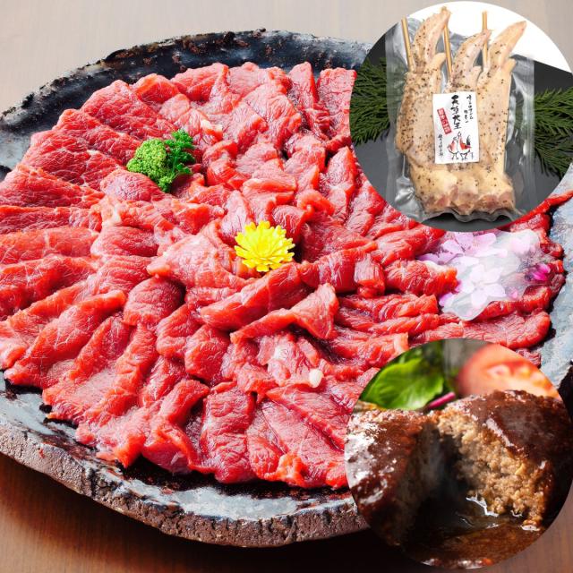 くまもと食彩の力 馬刺し 天草大王 あか牛 3種類セット 馬刺し 上霜降り & 天草大王 大手羽先 & あか牛 ハンバーグ 熊本 馬肉 地鶏 あかうし