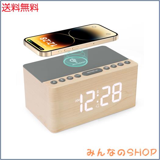 ANJANK 木製目覚まし時計付きBluetoothスピーカー、FM ラジオ、ワイヤレス充電器、USB 充電ポート、0~100% 調光器、スリープタイマー、デ