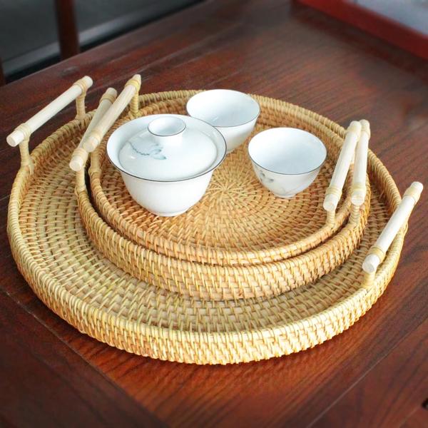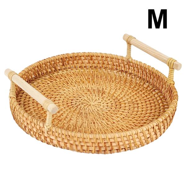 手織り籐収納トレイ ハンドル付きディナーサービストレイ フルーツケーキウィッカーバスケット 朝食パンとフードプレート