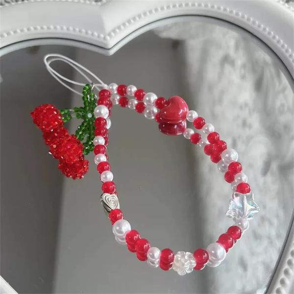 電話ストラップ付きキーホルダー カメラ用ストラップ AirPods用ペンダント かわいいチェリーフルーツ 携帯電話ストラップ チェーンノット 韓国語