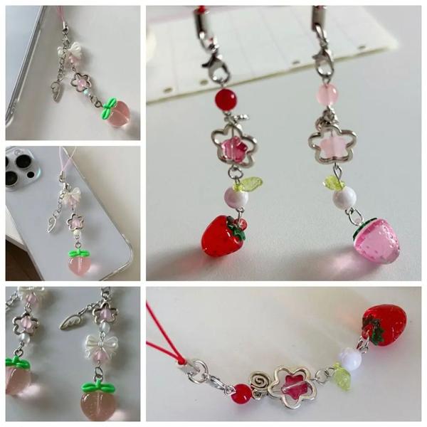 ストロベリー電話ストラップ 甘いy2k 透明 ビーズの果物 電話チェーン ピンク 赤 桃 電話ストラップ チャーム 携帯電話キーホルダー