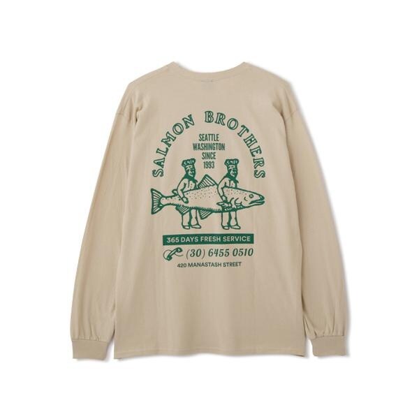 MANASTASH/マナスタッシュ/L/S TEE SALMON/ロングスリーブTシャツ サーモン人気のCiTeeシリーズのサーモン柄に新色が登場です!素材・CiTeeのコットン100%特徴・MANASTASHで一番ベーシックなTシャツ素材【CiTee】を使ったL/S Tシャツ。・シアトルにある、1993年創業、兄弟で始めた架空のレストラン【SALMON BROTHERS】のお土産スウェット、という体のグラフィック。スタイリングボトムスに関しては、クライミングパンツやコーデュロイのパンツとの合わせが王道ですが、ベーシックな長袖Tシャツなので、トラックパンツ等のパンツとスポーティに合わせてもマッチします。程よい厚さの生地なので春先や秋口にも大活躍してくれるアイテム。MANASTASH/マナスタッシュ1993年に米国シアトルで設立された<MANASTASH>。ブランド名の由来となる北アメリカ大陸の西海岸沿いを南北に走るカスケード山脈から駆け落ちるマナスタッシュ山高原は、スキーやトレッキング、マウンテンバイク、ラフティング、カヤックなど多様なアウトドアスポーツが楽しめることで有名です。創業時よりヘンプやリサイクルフリースなど環境に優しい素材を採用して最高のアイテムを作ることを理念に掲げ、旧き良きアメリカのプロダクトをデザインベースにしたライフスタイルブランドは、ファッションとカルチャーをクロスオーバーさせた新しいスタイルを提案します。