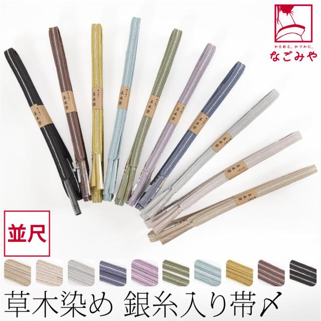 味わい深い草木染めに銀糸が輝く優しい色合い、セミフォーマルにも使える帯締めです。