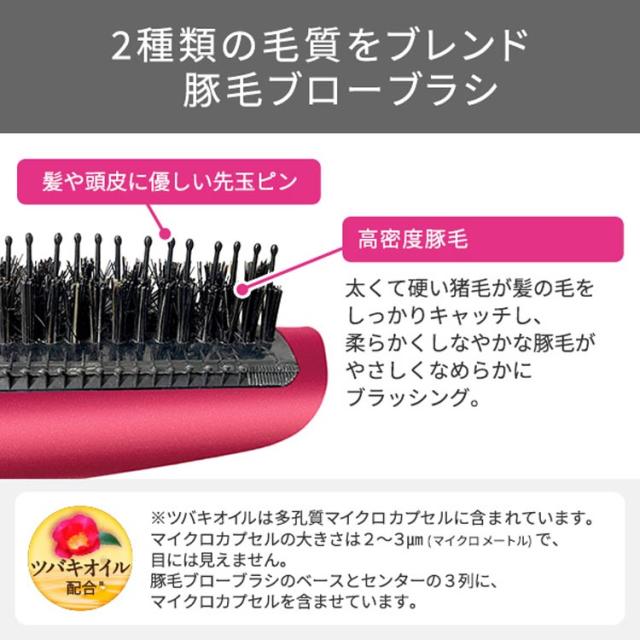 ●豚毛ブローブラシの黒色部分全面(ブラシセンター3列とブラシベース)にツバキオイルを配合したマイクロカプセルを含ませています。※ ツバキオイルは多孔質マイクロカプセルに含まれています。マイクロカプセルの大きさは2〜3マイクロメートルで目には見えません。
