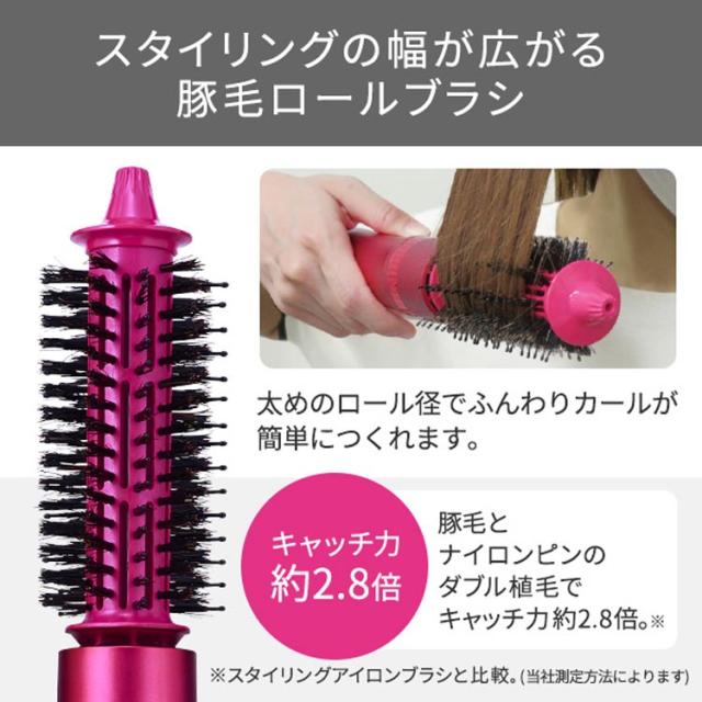 ●豚毛とナイロンピンのダブル植毛のブラシでキャッチ力約2.8倍※!径が太く、360度回転しながら豚毛が髪の毛をしっかりキャッチするので ふんわりとしたナチュラルなカールが簡単につくれます。※ スタイリングアイロンブラシと比較。(メーカー測定方法による)