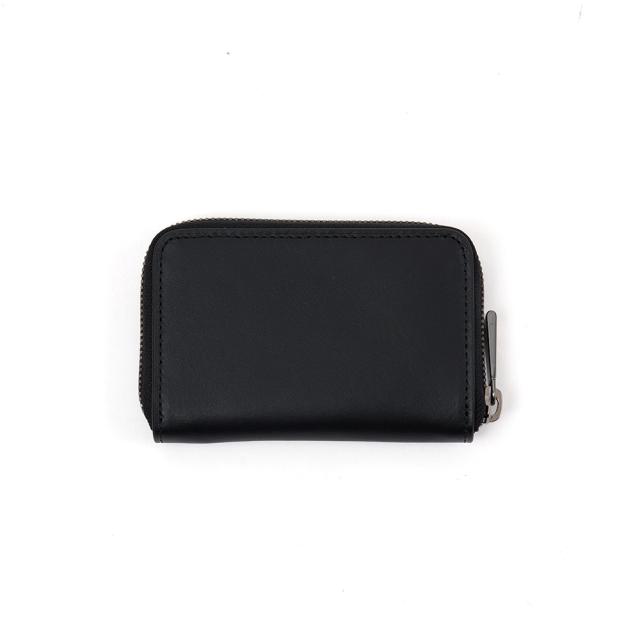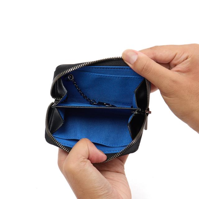 高級感あるラウンドファスナー型の小銭入れです。メインコンパートメントは仕切り付きで、硬貨を分けて収納が可能です。内側にはカードサイズのポケットが2つ、ホックで取り外しが可能なキーチェーンが1つあります。