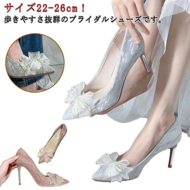 | サイズ22-26cm!歩きやすさ抜群のブライダルシューズです。 キラキラグリッターの大人顔パンプス☆ リボン&ポインテッドトゥでトレンドの足元へ。履くだけで美脚ヒール♪ 気軽に履けて美脚・脚長効果も抜群です! パーティー/謝恩会/卒業式/発表会/セレモニーなどフォーマルシーンからカジュアルシーンまでに。 | |