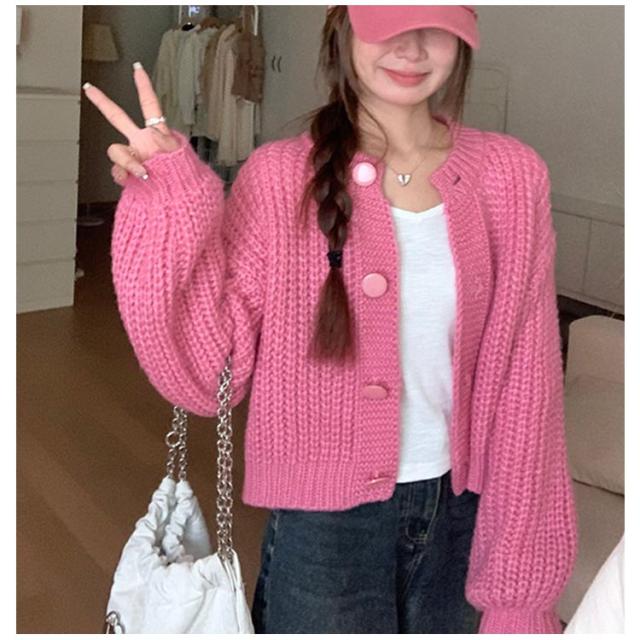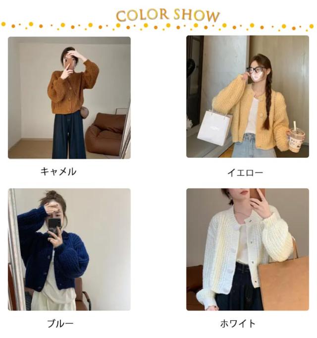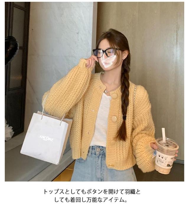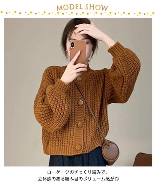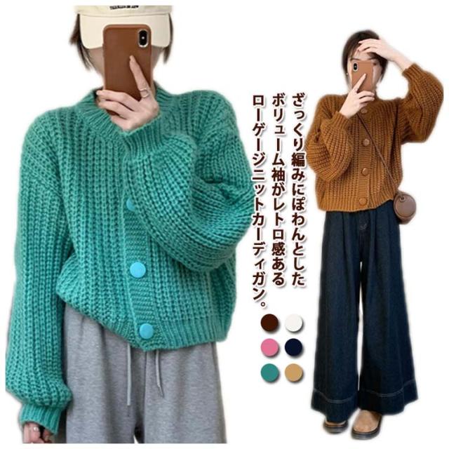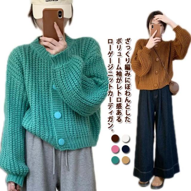 キャメル クルーネック 厚手 冬 羽織り 長袖 ニットカーディガン ニット ゆったり ニットトップス 秋 カーデ カーディガン ショート丈 ざっくり畦編み ボリューム袖 パフ袖 ニットカーデ ニットカーディガン 白 ネイビー 20代 30代 40代 50代 きれいめ おしゃれ