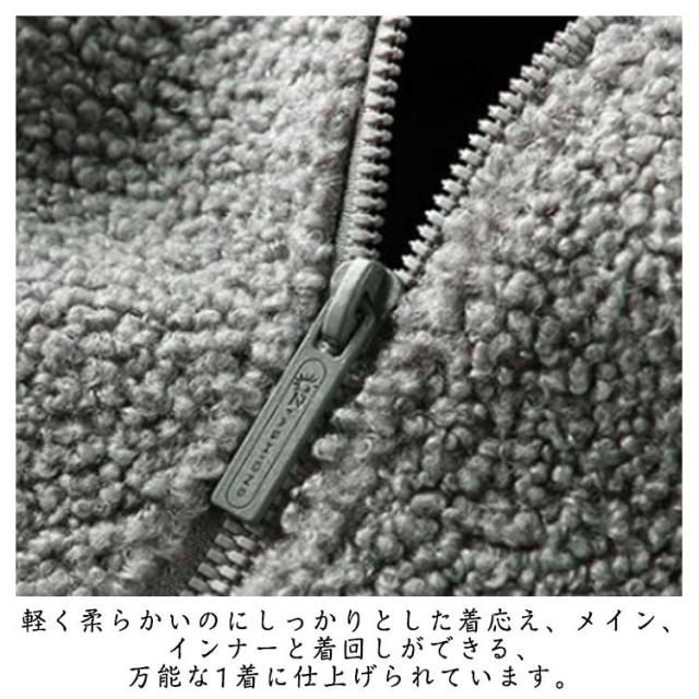 | ボアフリースジャケット。 ジッパー付きの胸ポケット。 首元はスタンドカラー。 フロント両側のポケット。 軽く柔らかいのにしっかりとした着応え、メイン、インナーと着回しができる、万能な1着に仕上げられています。 | |